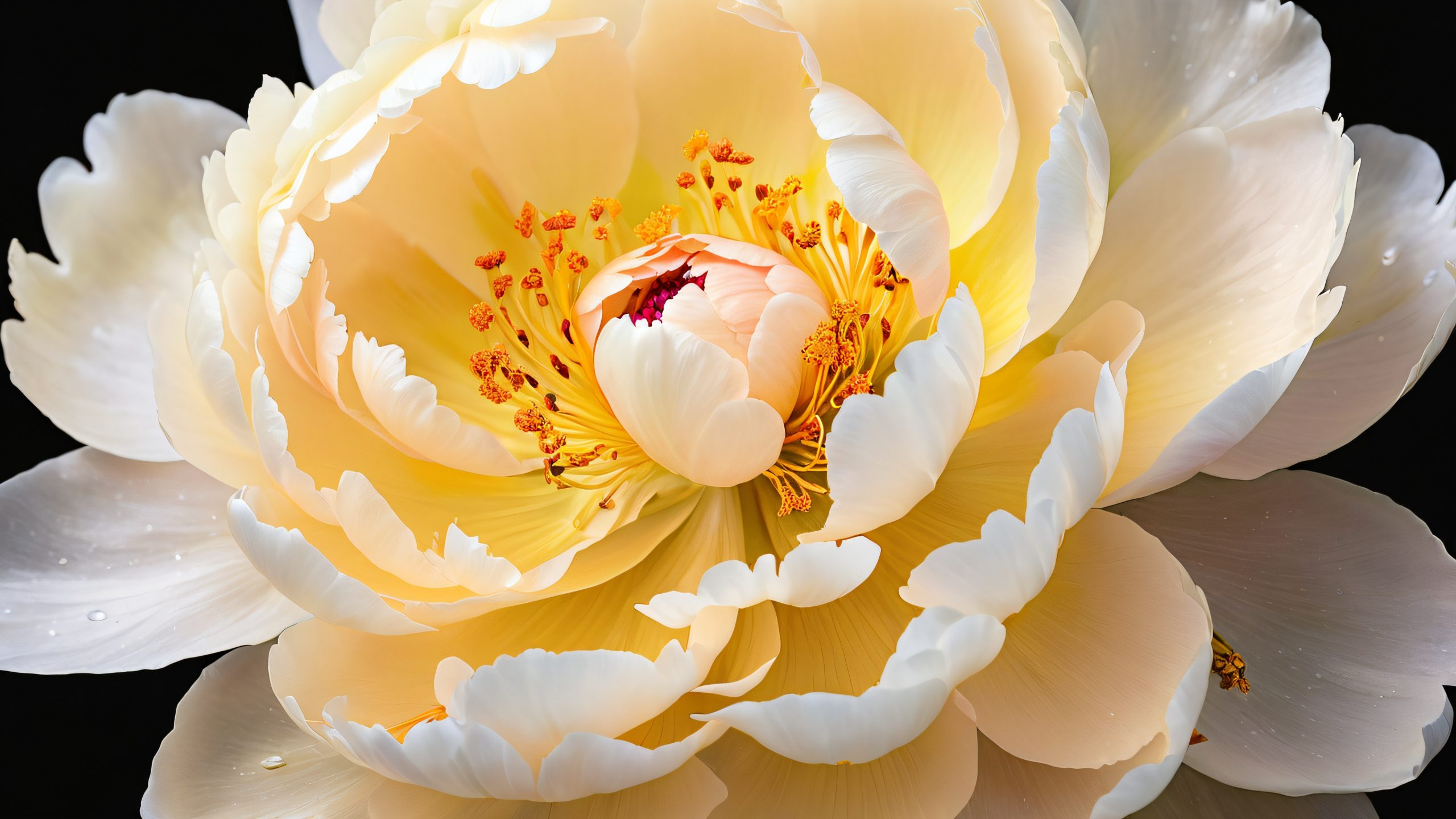 This stunning 4K wallpaper features an oversized peony flower in mid-bloom, its delicate petals unfolding like a work of art against a velvety black background. The vibrant golden-yellow stamen radiates outward like the sun, surrounded by swirling patterns reminiscent of Asian calligraphy. Softbox lighting with warm, golden tones and subtle shadows enhances the flower’s textures and dimensionality, while soft hues of peach, ivory, and gold add depth to the scene.