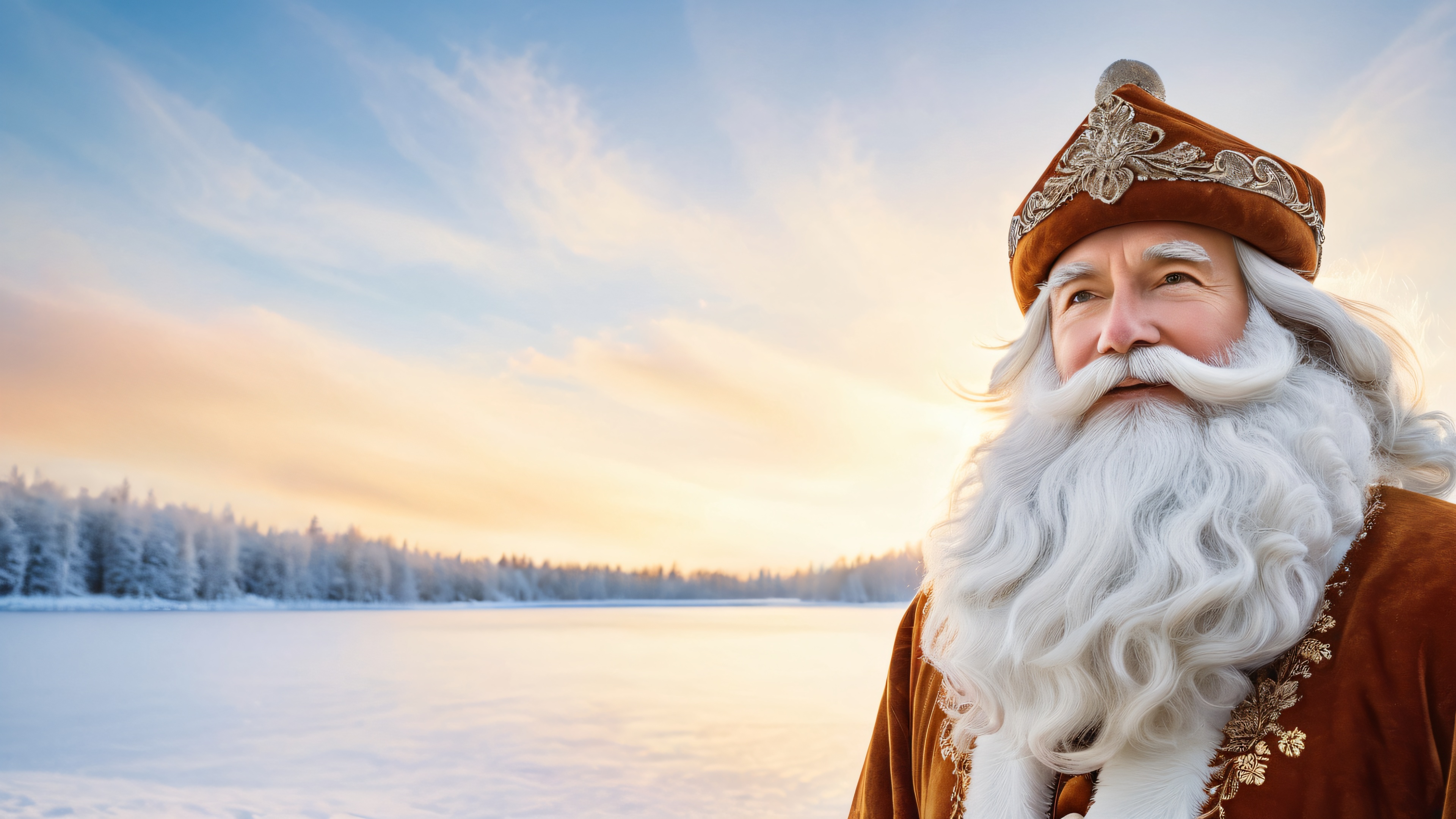 This stunning 4K wallpaper features a majestic pewter Santa Claus standing proudly amidst a serene winter landscape. The scene is set against a deep blue sky with wispy cirrus clouds, with a vast snow-covered lake featuring frozen waterfalls and misty frosty air. The image is characterized by warm, golden softbox lighting with subtle highlights and soft shadows, evoking a sense of nostalgia and warmth. Earthy tones of sienna, terracotta, and moss are complemented by accents of pewter and frosty blues, creating a masterpiece of winter wonder.