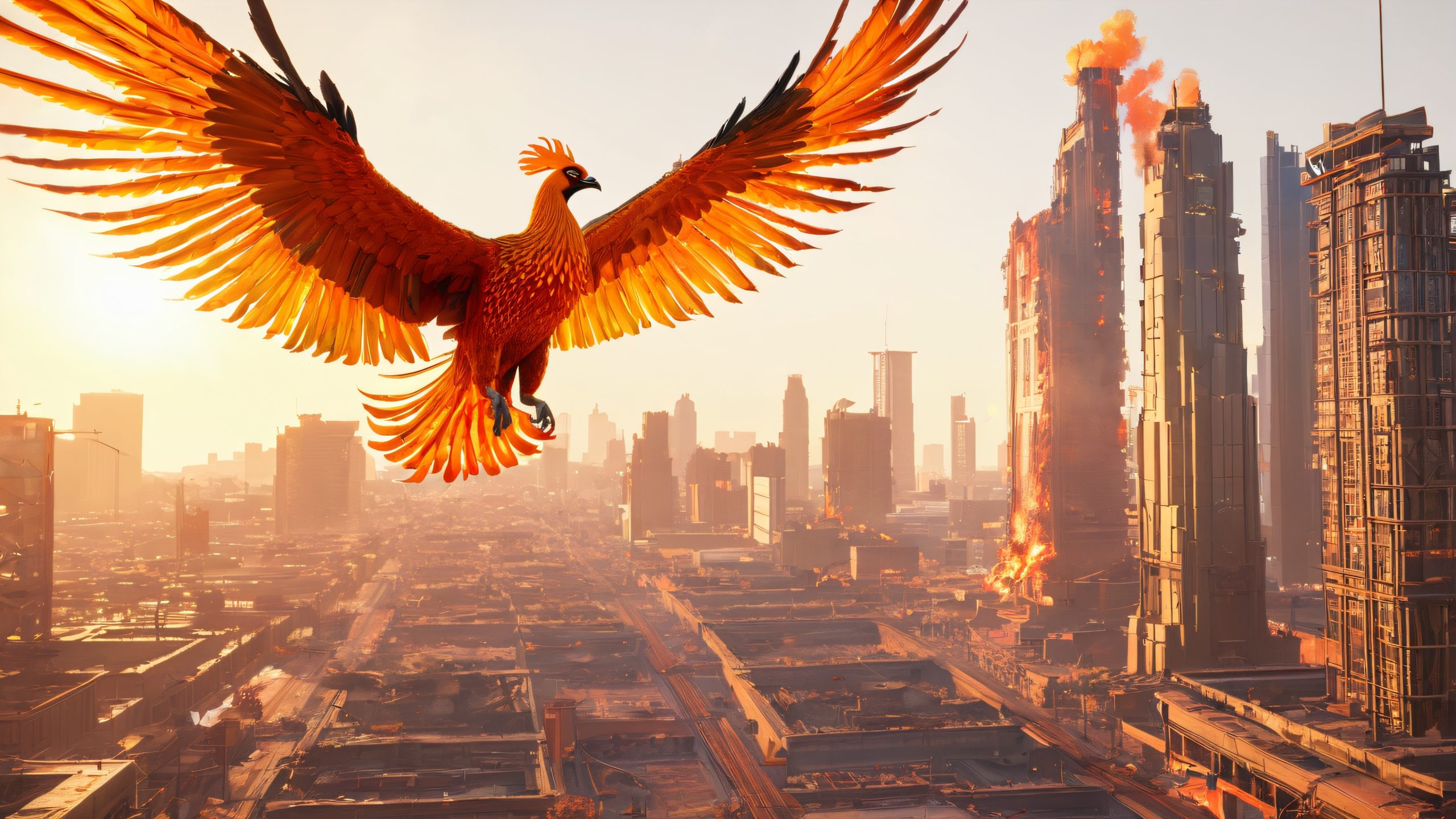 This breathtaking 4K wallpaper depicts a majestic phoenix rising from the ashes of a post-apocalyptic cityscape, its fiery plumage illuminating the desolate landscape. The phoenix’s wings are spread wide, its eyes blazing with an inner light that seems to pierce the fabric of reality. The city’s crumbling skyscrapers, twisted metal, and smoky haze create a haunting atmosphere, while the phoenix’s flames cast a warm, golden glow.