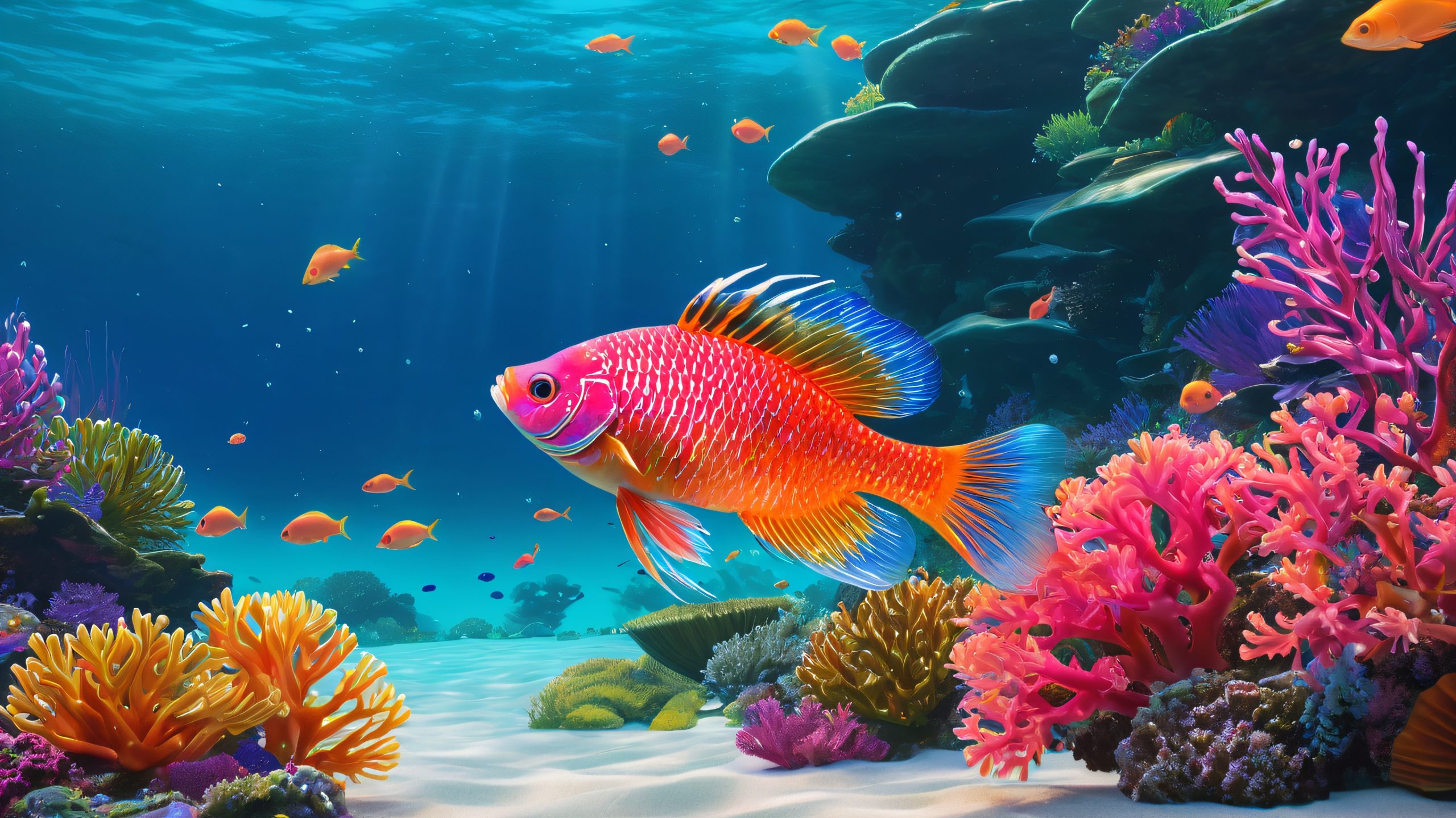 This stunning 4K desktop wallpaper features a majestic red fish swimming through a vibrant underwater cityscape. The fish’s scales shimmer like polished gemstones as it navigates through the bustling metropolis. The scene is adorned with glowing coral, schools of bioluminescent fish, and towering kelp forests, creating a truly mesmerizing visual experience.