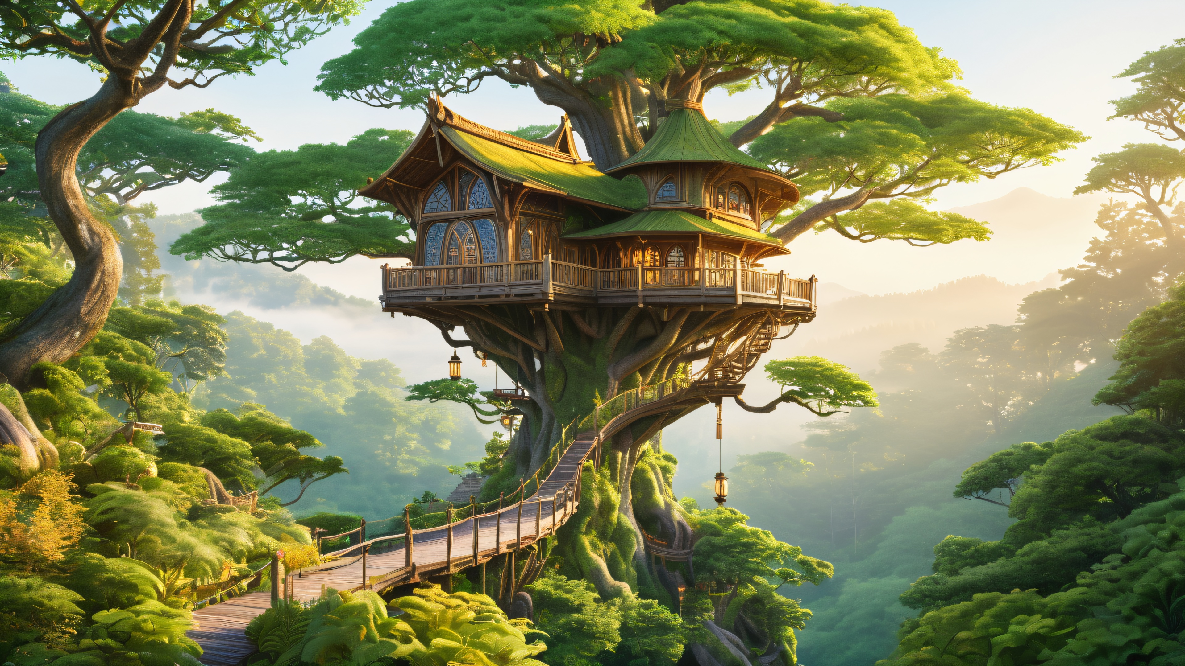 This enchanting 4K wallpaper transports you to a whimsical world of wonder, featuring a majestic treehouse with intricate wooden details, softly glowing lanterns, and a sprawling canopy of lush greenery. The scene is bathed in soft, golden morning light, casting long shadows and illuminating the treehouse’s intricate details. The surrounding forest is dense and misty, with towering trees and a carpet of emerald green undergrowth.