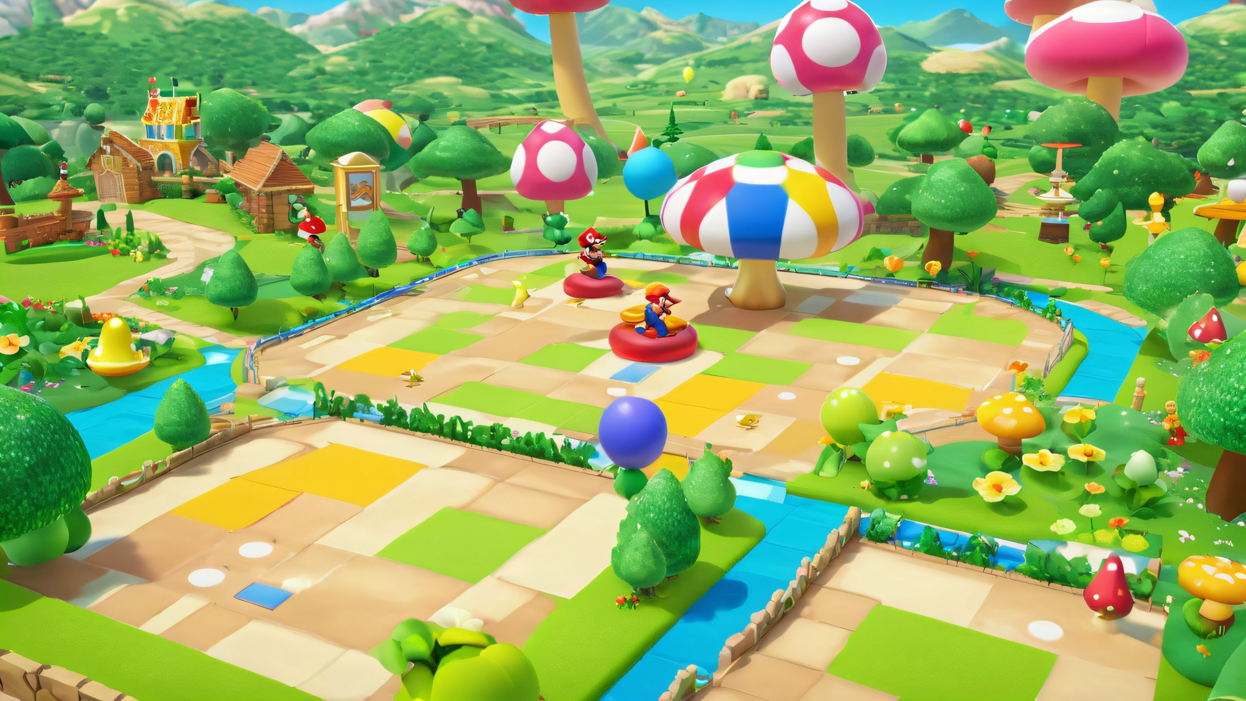 Whimsical 4K desktop wallpaper featuring Mario Party 2 game boards, with vibrant details and retro charm.