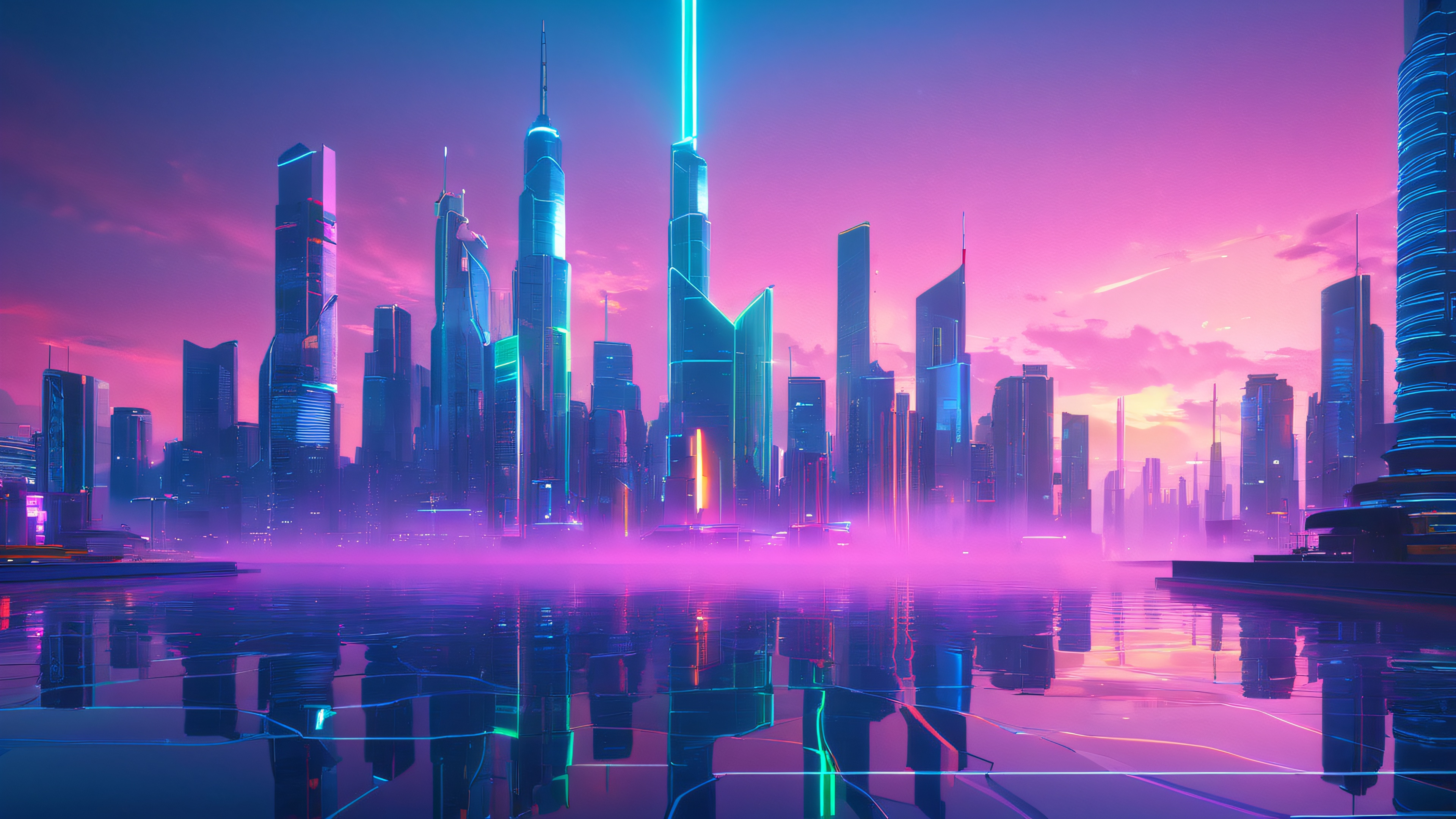 This stunning 4K wallpaper features a hyper-realistic 3D render of a bustling metropolis at night. The city’s towering skyscrapers and streets are bathed in a kaleidoscope of colors, with pulsing blue and green lights reflected in the wet pavement. The atmosphere is moody and atmospheric, with subtle highlights and shadows creating depth and dimension. The color palette is electric, featuring blues, pinks, silvers, indigo, and oranges, evoking the dynamic energy and euphoric emotions of electronic music.
