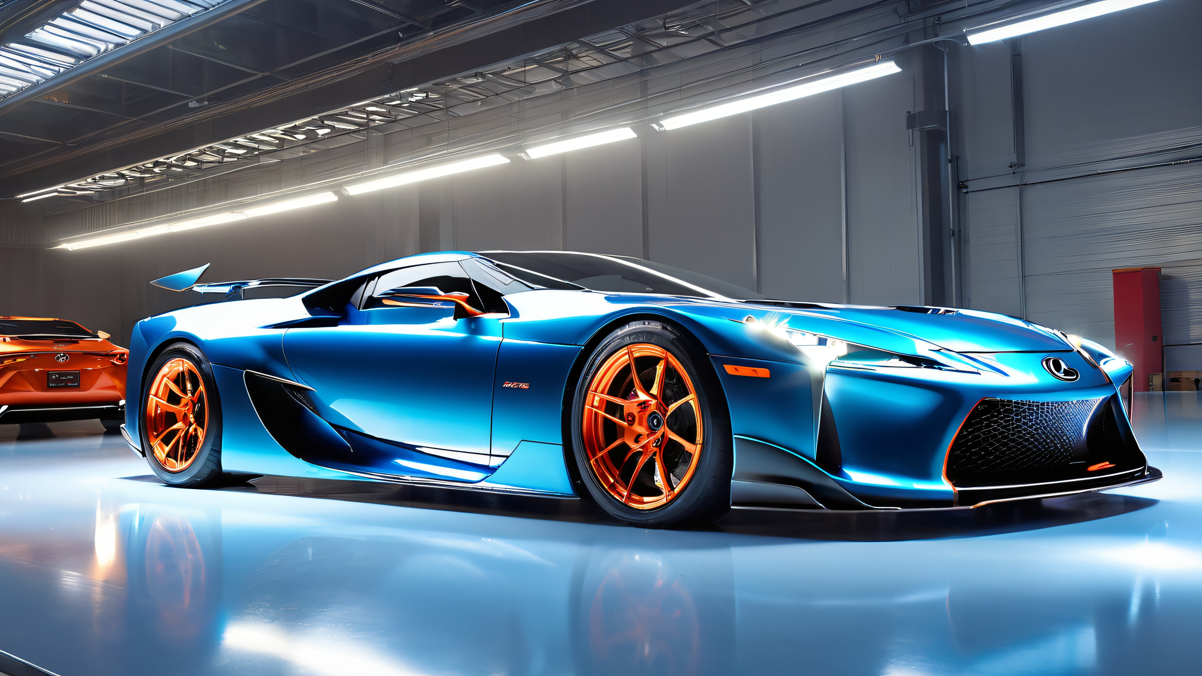 A stunning 4K wallpaper featuring the Lexus LFA in its full glory, radiating energy through intricate details and cinematic lighting. The high-tech garage or showroom provides a striking backdrop, punctuated by shafts of light that evoke the thrill of performance.