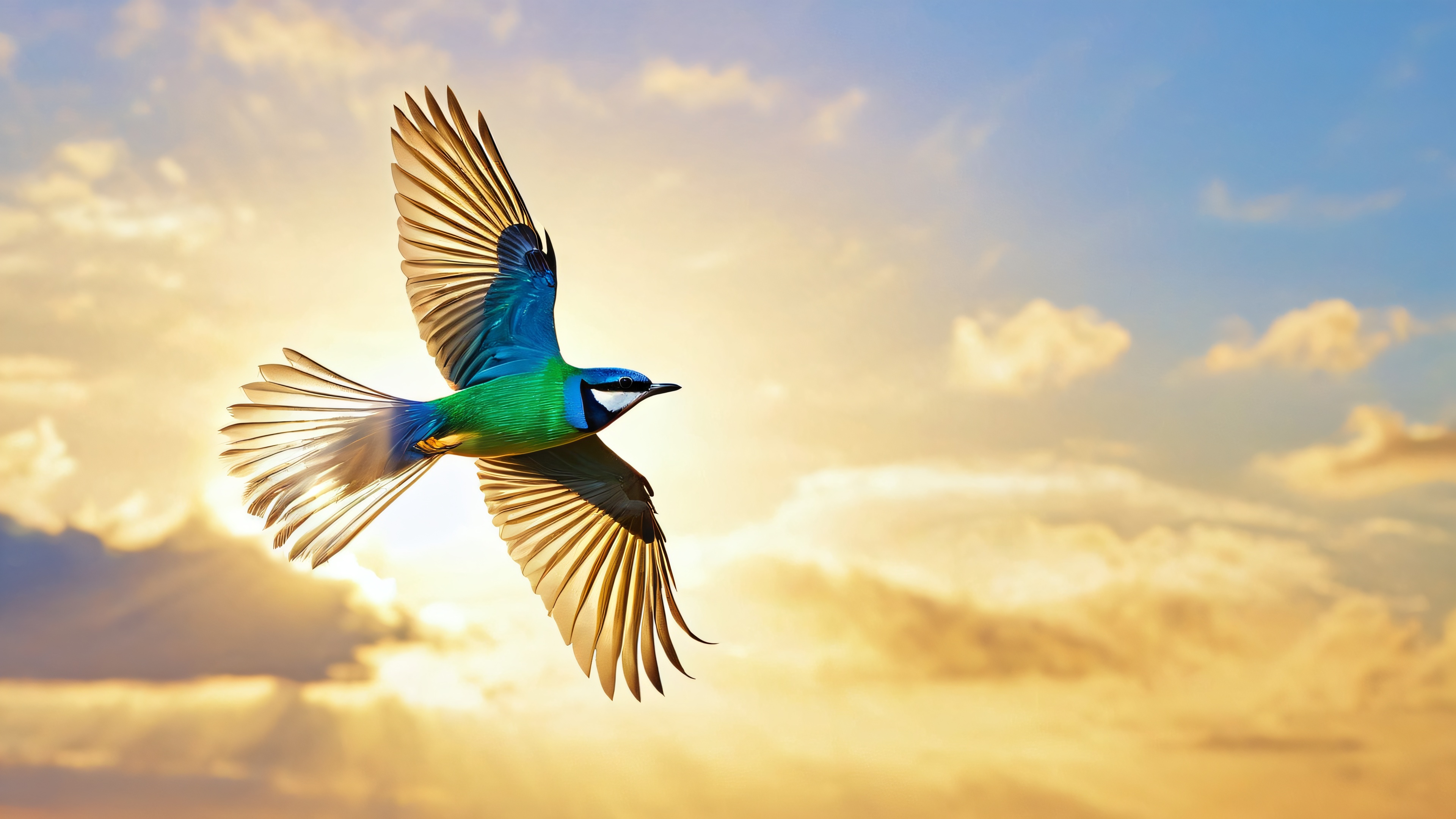 bird-in-flight · cerulean-blue · cloud-dotted-sky · golden-hues · iridescent-bird · natureArticle Categories: