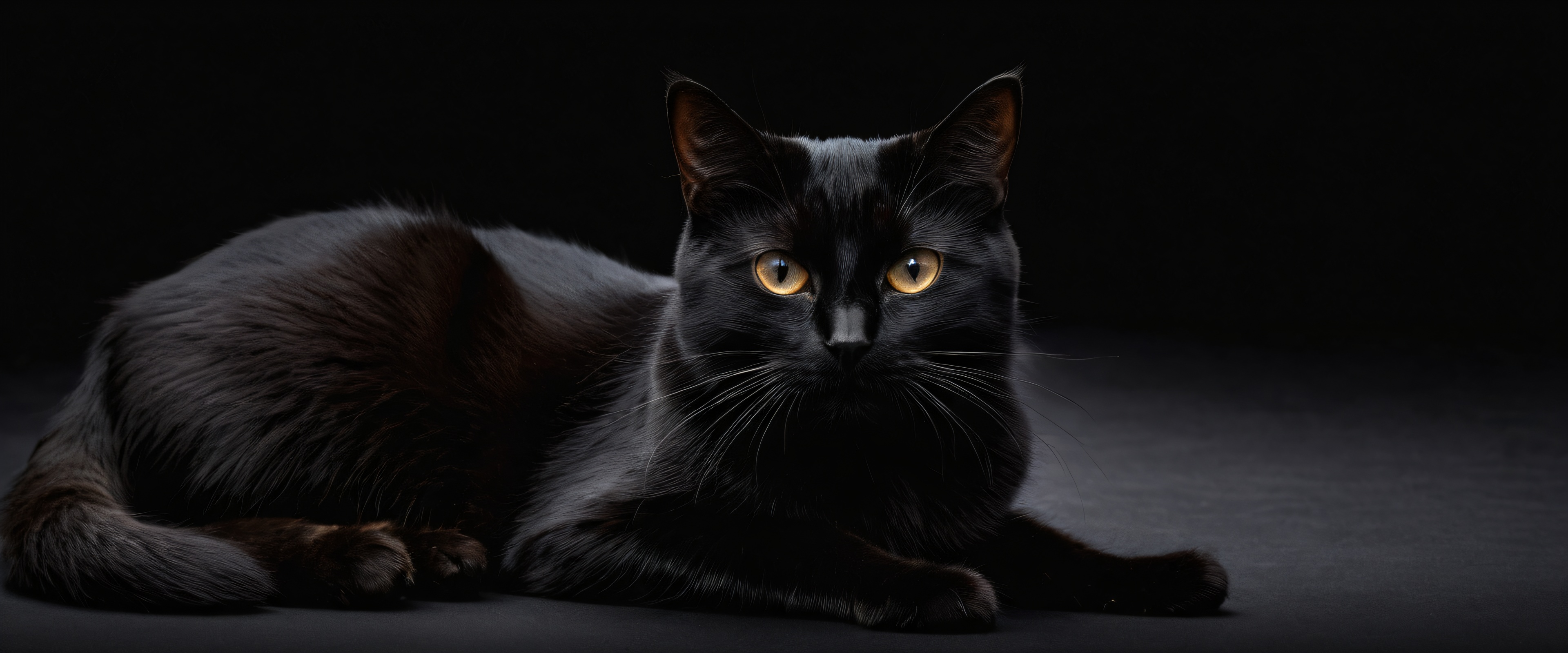 A breathtaking desktop wallpaper of black cat, perfectly clean vast pure void, extreme depth of field, award-winning digital art, pristine clarity, SLEEK DARK MODE AESTHETIC. Deep perfect blacks, striking crisp contrast, and elegant luminescent accents., [‘black’, ‘dark’], 21:9 ultrawide panoramic aspect ratio, epic wide shot, elegant low-key lighting, deep perfect blacks, striking contrast, sleek dark mode aesthetic, luminescent accents, deep rich colors, award-winning digital art, epic breathtaking scale, stunning visual impact, perfect composition, highly textured surfaces, intricate micro-details, physically based rendering, macOS wallpaper aesthetic, masterpiece, highest quality, highly detailed, 8k resolution.