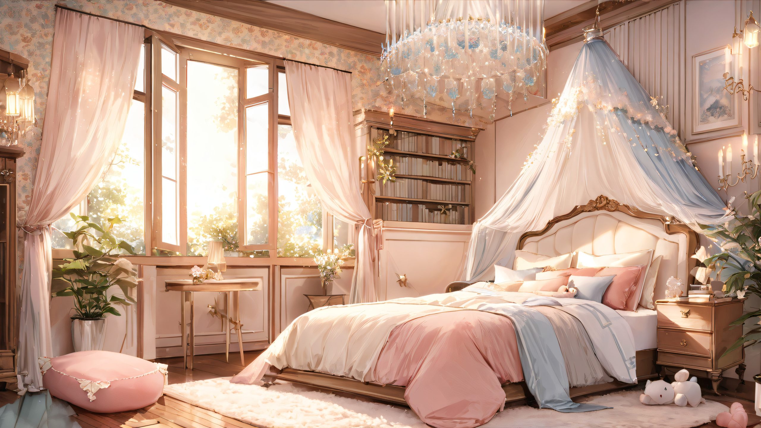 This stunning wallpaper features a serene midnight bedroom setting, where the gentle glow of the moon illuminates the plush carpeting, wooden furniture, and delicate lace canopy. The creamy white bedding is adorned with plush toys and favorite books, while subtle pops of bright red from the pillows add a touch of warmth. Watercolor-inspired textures and whimsical illustrations create a soft, dreamy atmosphere.