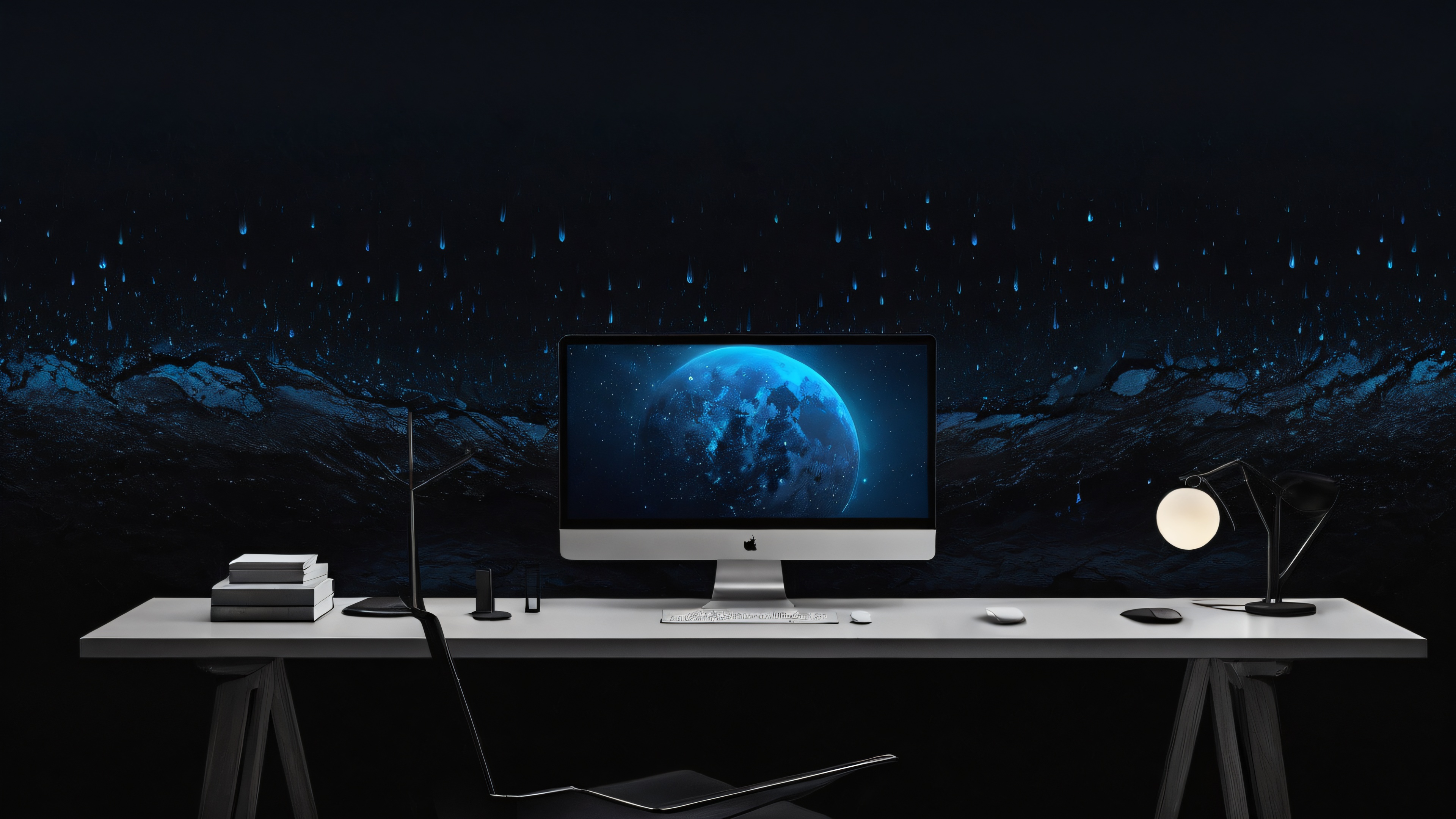 A breathtaking desktop wallpaper of Ditto, Perfectly clean vast pure void, extreme depth of field, darkened room with rain, Award-winning digital art, pristine clarity, modern watercolor, SLEEK DARK MODE AESTHETIC: Deep perfect blacks, striking crisp contrast, and elegant luminescent accents, [‘Gray’, ‘Blue’], 16:9 aspect ratio, elegant low-key lighting, deep perfect blacks, striking contrast, sleek dark mode aesthetic, luminescent accents, deep rich colors, award-winning digital art, epic breathtaking scale, stunning visual impact, perfect composition, highly textured surfaces, intricate micro-details, physically based rendering, macOS wallpaper aesthetic, masterpiece, highest quality, highly detailed, 8k resolution.