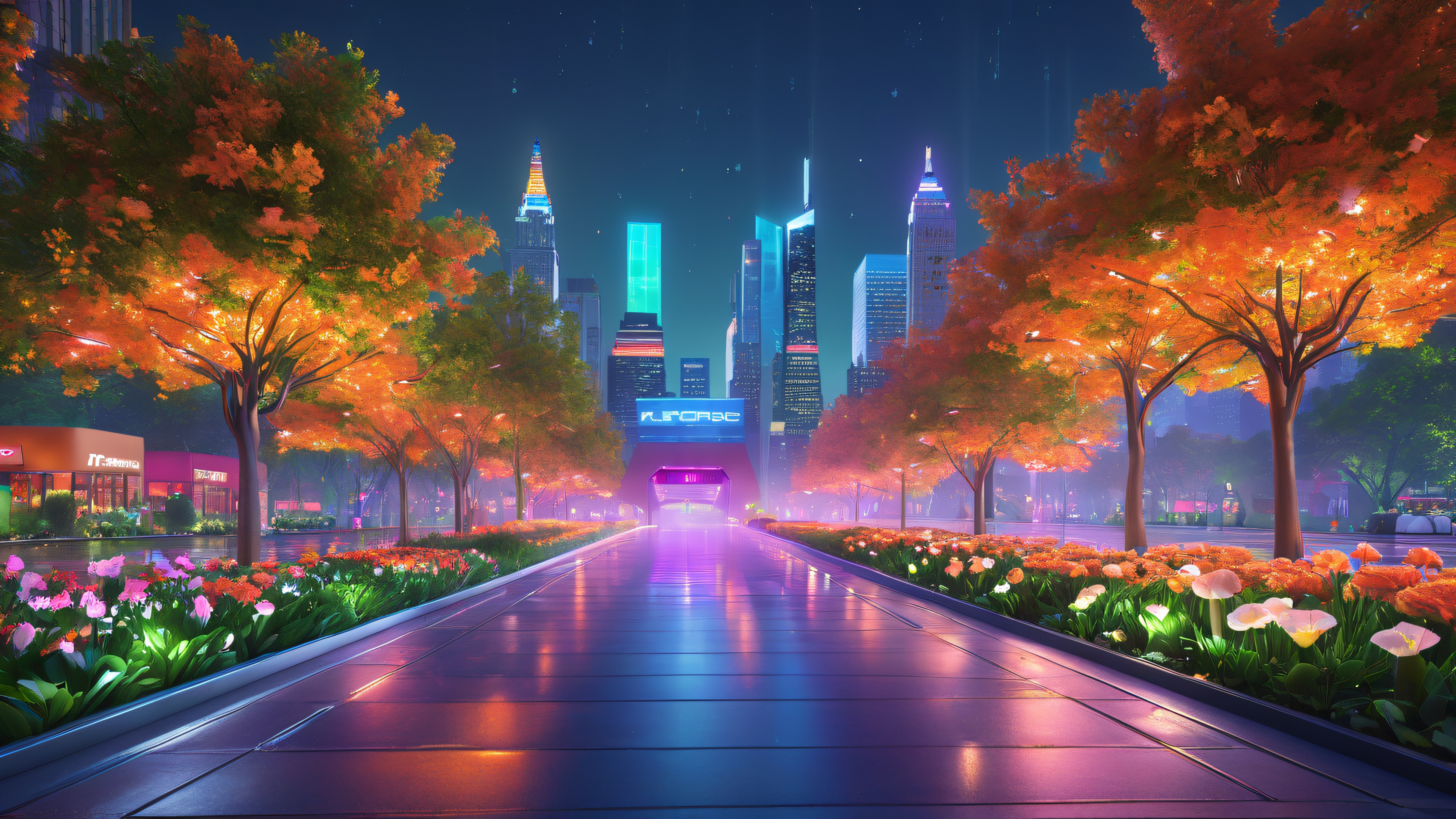 This breathtaking 4K image features a futuristic cityscape at night, with sleek skyscrapers and a vibrant central park inspired by Material Design principles. The scene is illuminated by neon lights reflecting off wet pavement, adding depth to the atmosphere. Hyper-realistic 3D rendering provides subtle texture and shading, while a blend of warm and cool lighting highlights design elements and ambient streetlights cast a soft glow on surrounding architecture.