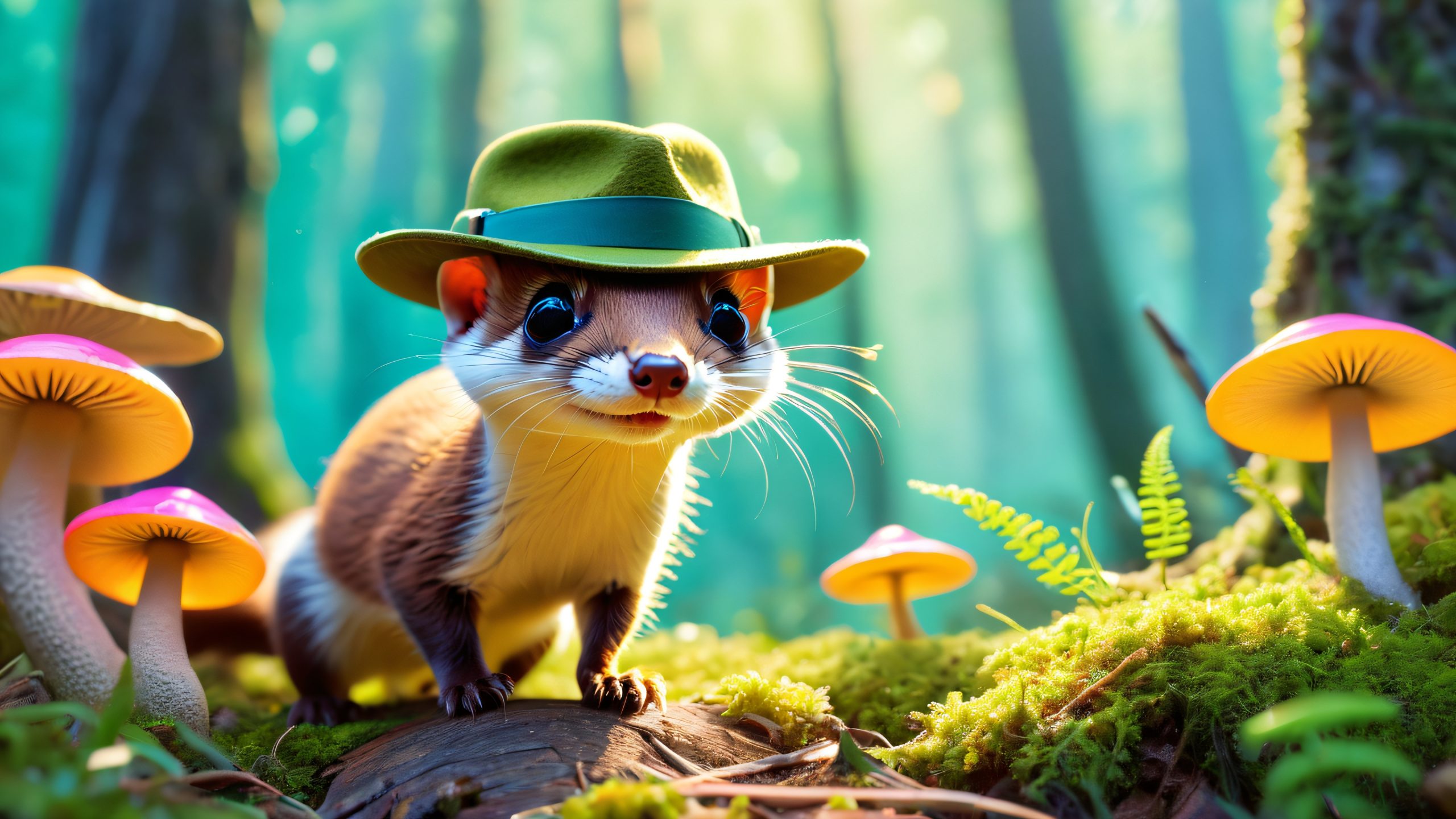 A whimsical scene unfolds beneath the light of golden sunset, where a playful weasel dons oversized sunglasses and fedora, its eyes sparkling with mischief. The forest floor is aglow with soft luminescent moss and twinkling fireflies, while ancient gnarled trees stand sentinel in the background. Vibrant colors dance across the artwork, featuring neon hues and earthy tones.