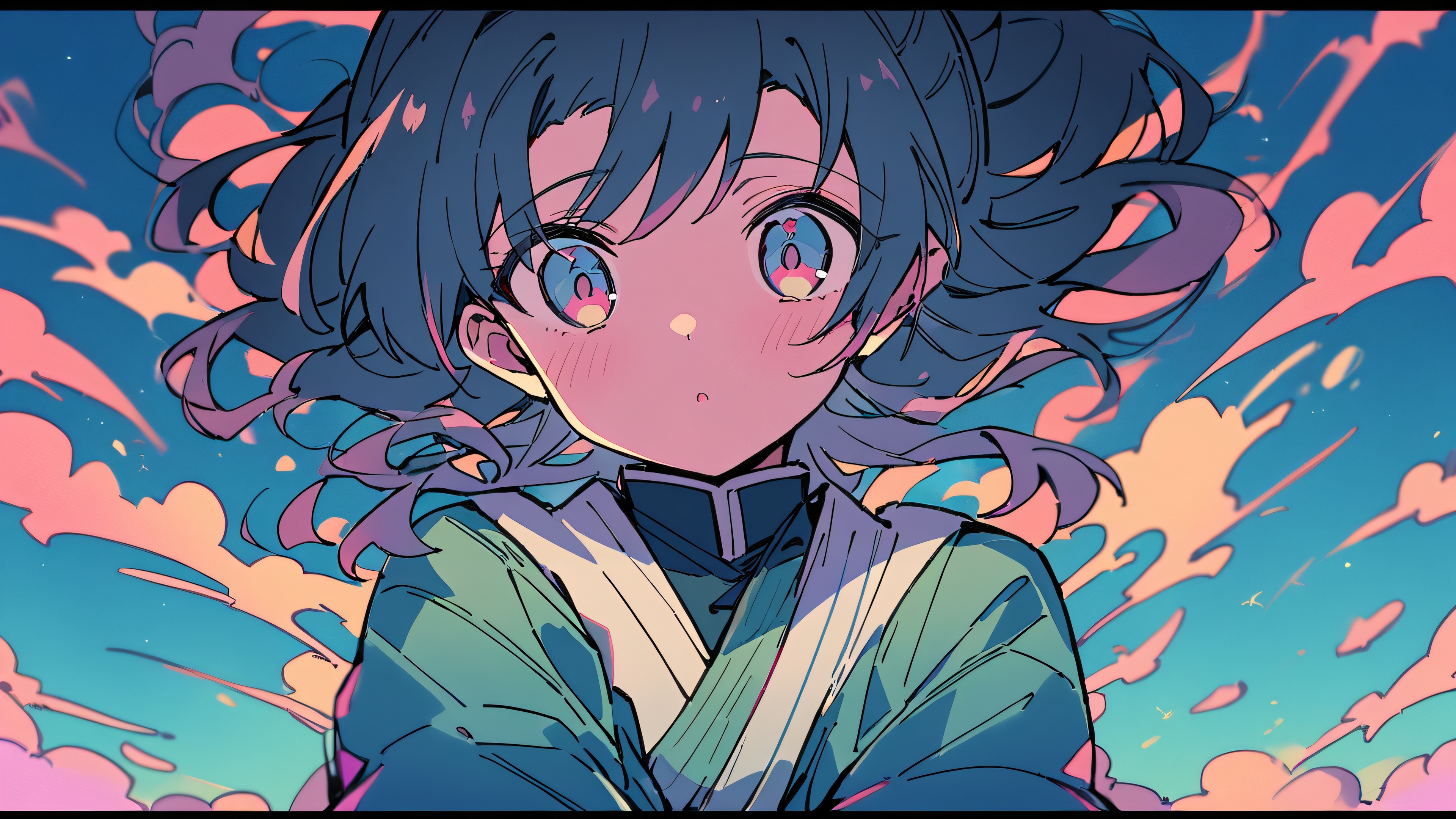 A masterpiece of a solo scene featuring Mitsuri Kocho from Demon Slayer, set against a breathtakingly beautiful sky with subtle gradient blue tones and extreme depth of field. The vibrant colors and cinematic lighting create a sense of ethereal wonder.