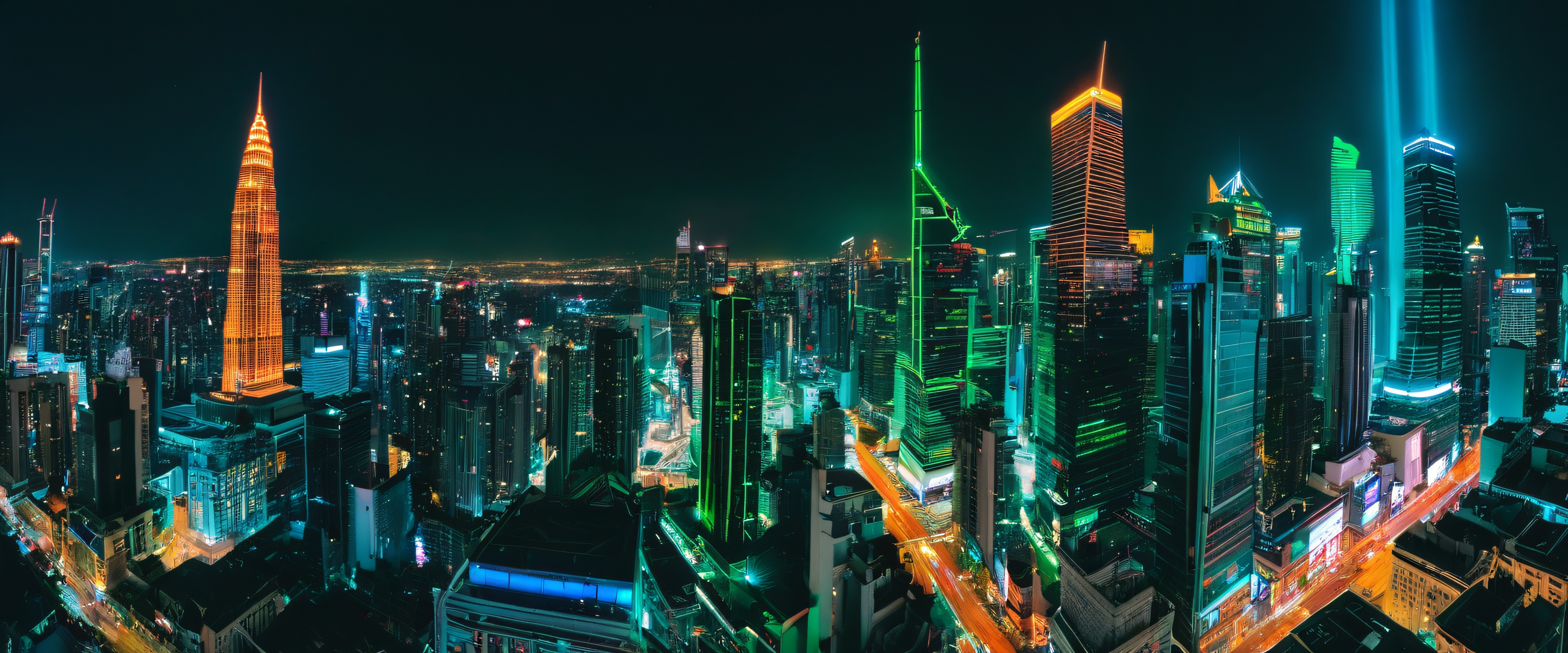 Experience the vibrant atmosphere of a bustling metropolis with this breathtaking 21:9 ultrawide panoramic wallpaper. The scene is bathed in a kaleidoscope of colors from the neon lights and city lights, which illuminate the towering skyscrapers and busy streets. The subtle blue-green glow of the night sky adds depth to this highly detailed and realistic masterpiece.