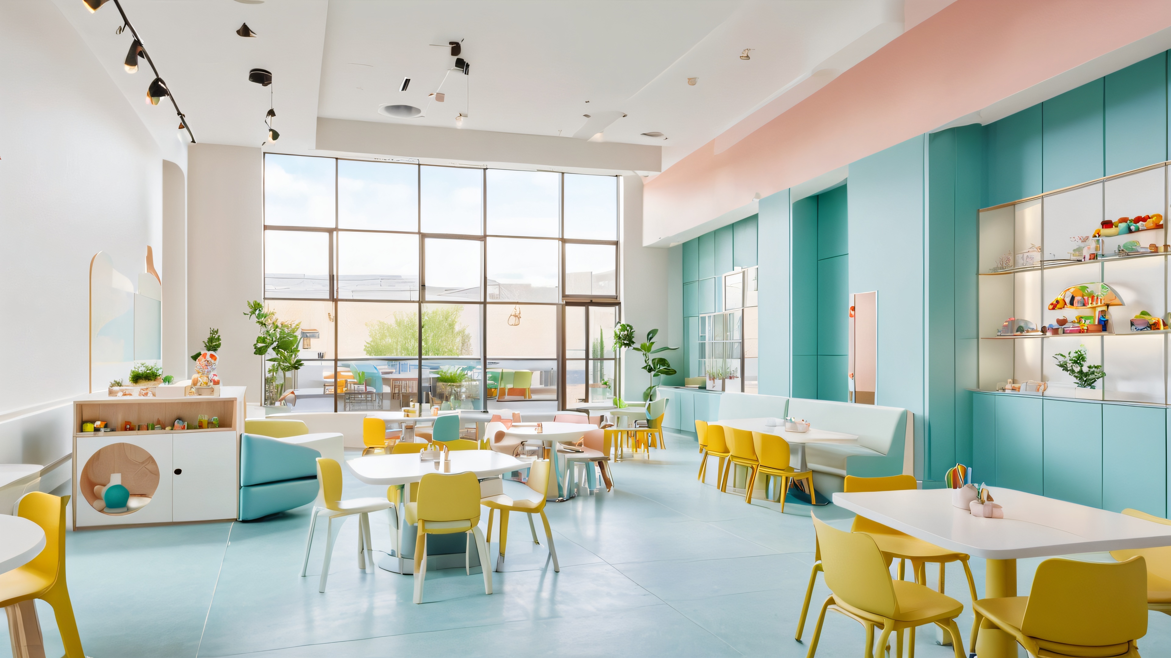 This stunning 4K desktop wallpaper showcases a sleek, industrial-chic restaurant play area, characterized by a soft, pastel color palette, rounded edges, and modular furniture design. The open-plan space features a magnetic wall, mini-stage for puppet shows, and sensory play zone with textured surfaces and tactile toys. The play area is bathed in warm, ambient overhead lighting and natural light filtering in through the glass wall, with subtle accent lighting highlighting interactive elements.