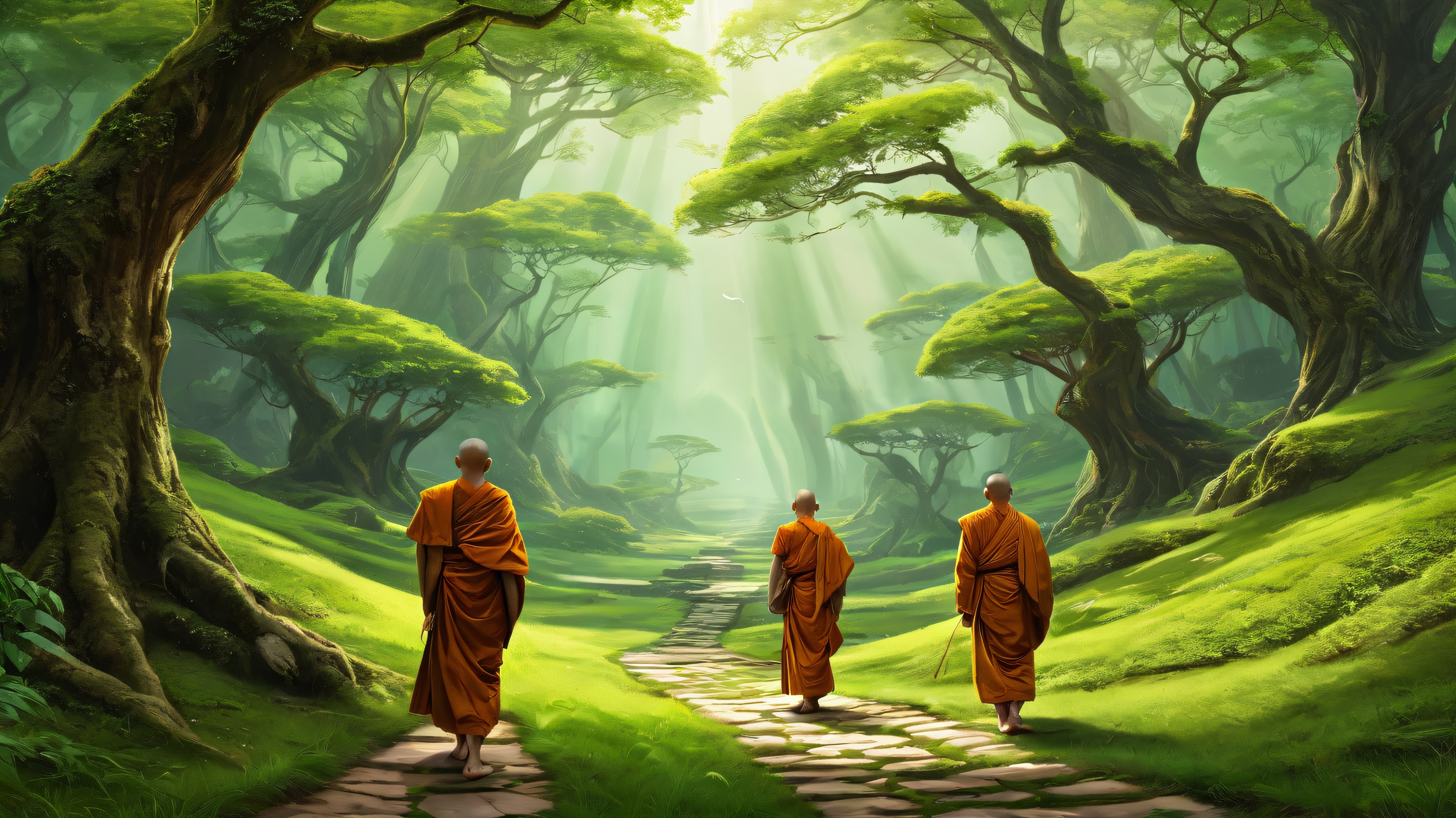 A breathtaking desktop wallpaper of Monks, perfectly clean vast pure void, extreme depth of field, award-winning digital art, pristine clarity, ETHEREAL LIGHTING. Radiant, brilliant colors, ray traced reflections, and pristine clarity. Bright and airy.., [‘Green’, ‘Brown’], 16:9 aspect ratio, ethereal lighting, radiant, brilliant colors, ray traced reflections, pristine clarity, award-winning digital art, epic breathtaking scale, stunning visual impact, perfect composition, highly textured surfaces, intricate micro-details, physically based rendering, macOS wallpaper aesthetic, masterpiece, highest quality, highly detailed, 8k resolution.