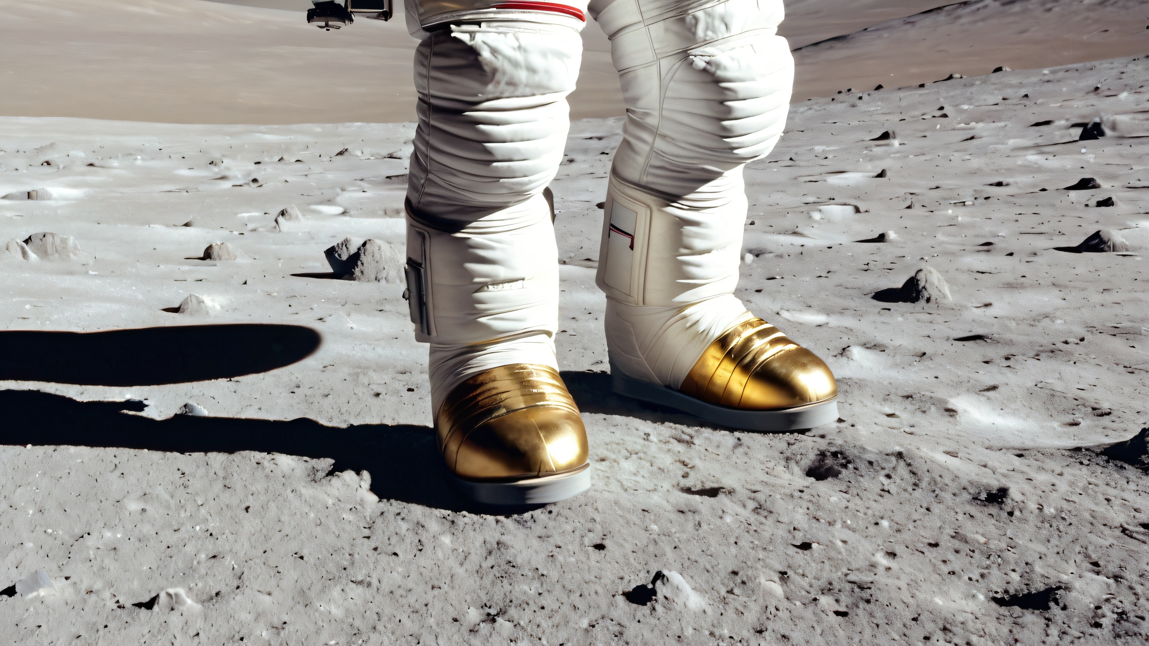 This stunning 4K wallpaper captures the majestic scene of astronaut Russell L. Schweickart standing confidently on the Lunar Module’s porch, bathed in warm sunlight that casts long shadows across the lunar regolith. The distant, cratered horizon stretches out to infinity, with the vibrant golden hue of the astronaut’s boots adding a pop of color to the desolate, rocky terrain. The American flag planted firmly behind him serves as a poignant reminder of the historic achievement.