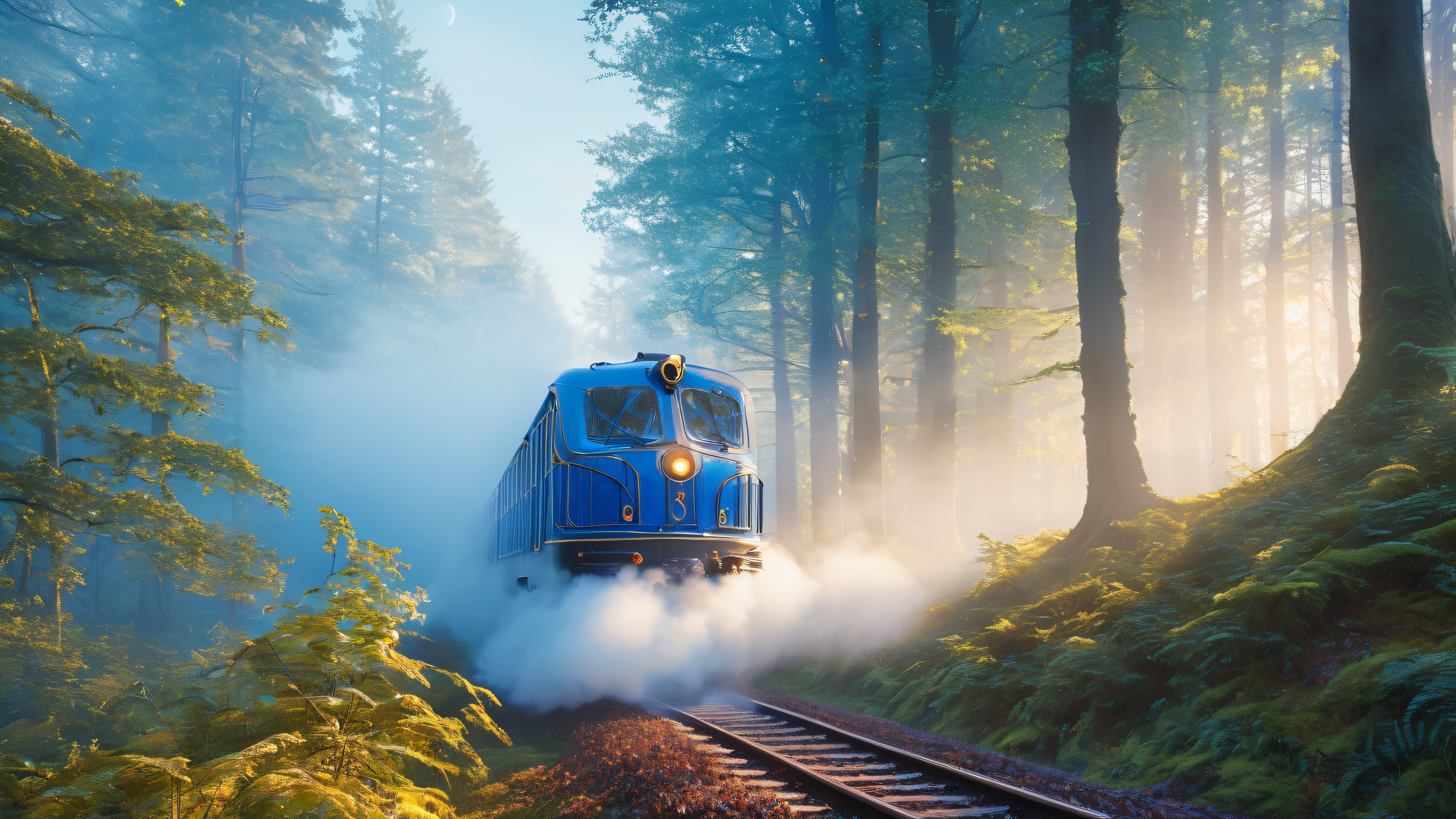 This hyper-realistic digital painting depicts a majestic train traversing a mystical forest, shrouded in a perpetual veil of mist. The train’s glowing blue windows and intricate gilded details stand out against the dark trees and eerie fog, while subtle atmospheric effects create a sense of depth and dimensionality. Soft lunar illumination casts long shadows across the forest floor, with hints of warm golden light emanating from the train’s windows.