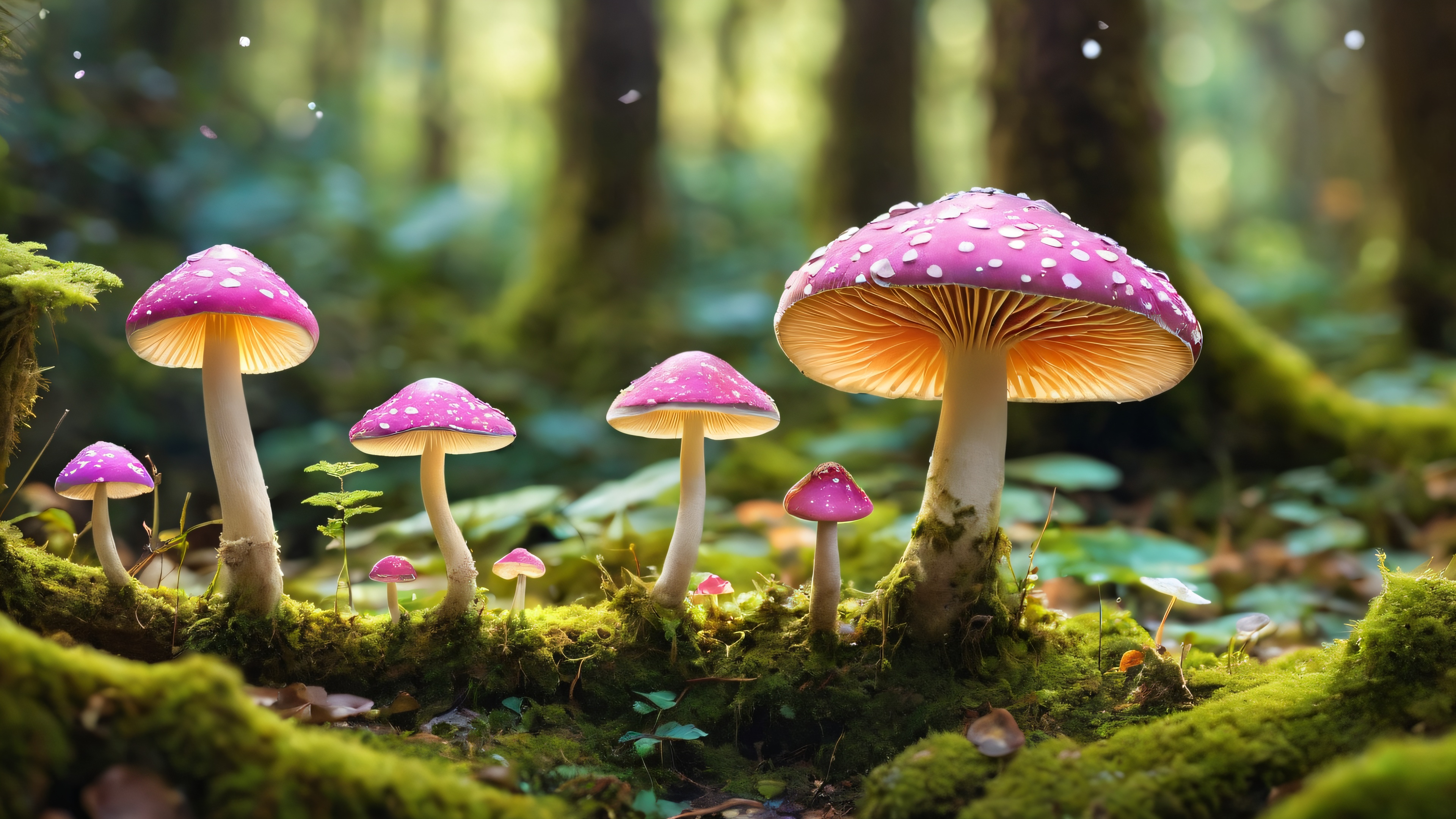 A breathtaking desktop wallpaper of Mushroom Spirit, Perfectly clean vast pure void, extreme depth of field, mossy forest floor, Award-winning digital art, pristine clarity, cinematic, colorful, mystical, Ethereal lighting, radiant brilliant colors, ray traced reflections, bright and airy, bokeh light orbs, [‘Golden’, ‘Pastel’, ‘Soft Pink’, ‘Cream’], 16:9 aspect ratio, ethereal lighting, radiant, brilliant colors, ray traced reflections, pristine clarity, award-winning digital art, epic breathtaking scale, stunning visual impact, perfect composition, highly textured surfaces, intricate micro-details, physically based rendering, macOS wallpaper aesthetic, masterpiece, highest quality, highly detailed, 8k resolution.