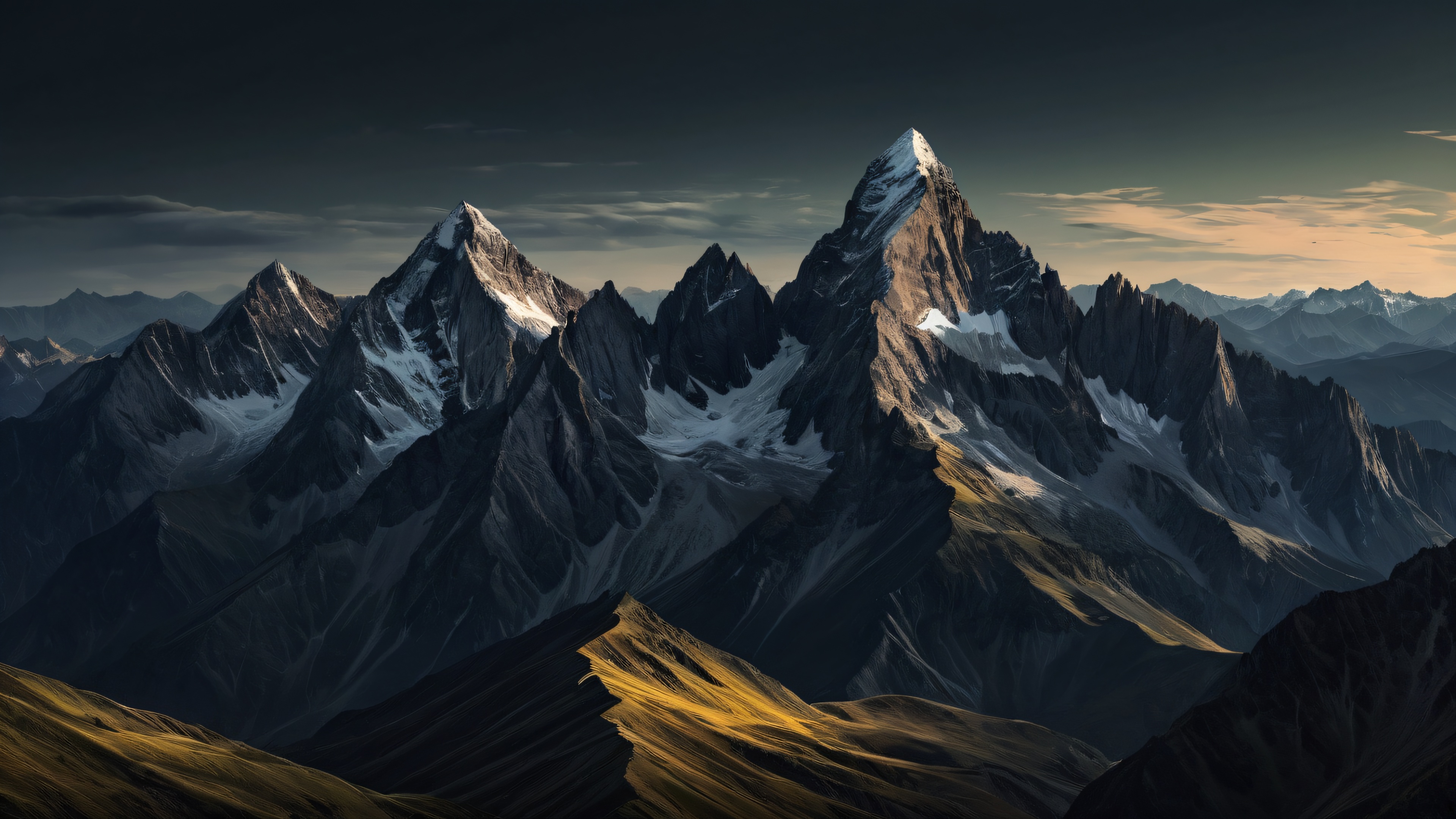 A breathtaking desktop wallpaper of Mountains, Perfectly clean vast pure void, extreme depth of field, allowing the majestic mountains to take center stage., Award-winning digital art, pristine clarity, featuring stunning mountain landscapes with intricate details and breathtaking depth of field., SLEEK DARK MODE AESTHETIC. Deep perfect blacks, striking crisp contrast, and elegant luminescent accents that highlight the rugged beauty of the mountains at dusk., {‘spectrum’: [‘Earth Tones’, ‘Blues’], ‘dominant’: ‘Olive Green’}, 16:9 aspect ratio, elegant low-key lighting, deep perfect blacks, striking contrast, sleek dark mode aesthetic, luminescent accents, deep rich colors, award-winning digital art, epic breathtaking scale, stunning visual impact, perfect composition, highly textured surfaces, intricate micro-details, physically based rendering, macOS wallpaper aesthetic, masterpiece, highest quality, highly detailed, 8k resolution.