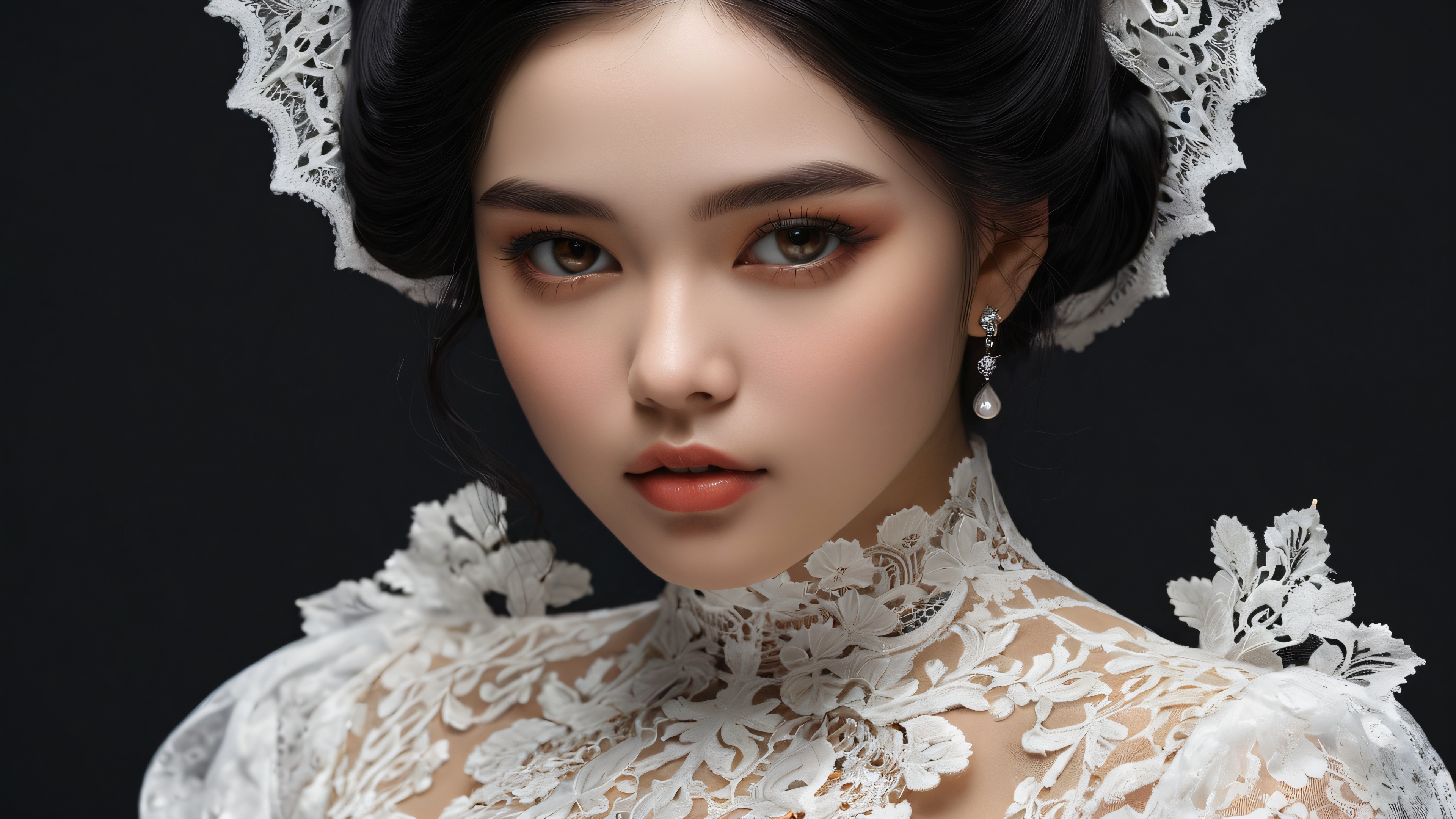 This breathtaking digital art piece transports you to an otherworldly realm where the juxtaposition of delicate lace and rugged skin creates an air of mystique. The deep, dark background serves as a canvas for the intricate details and textures that pop with stunning visual impact. The composition is perfect, with elegant luminescent accents enhancing the sense of mystery.