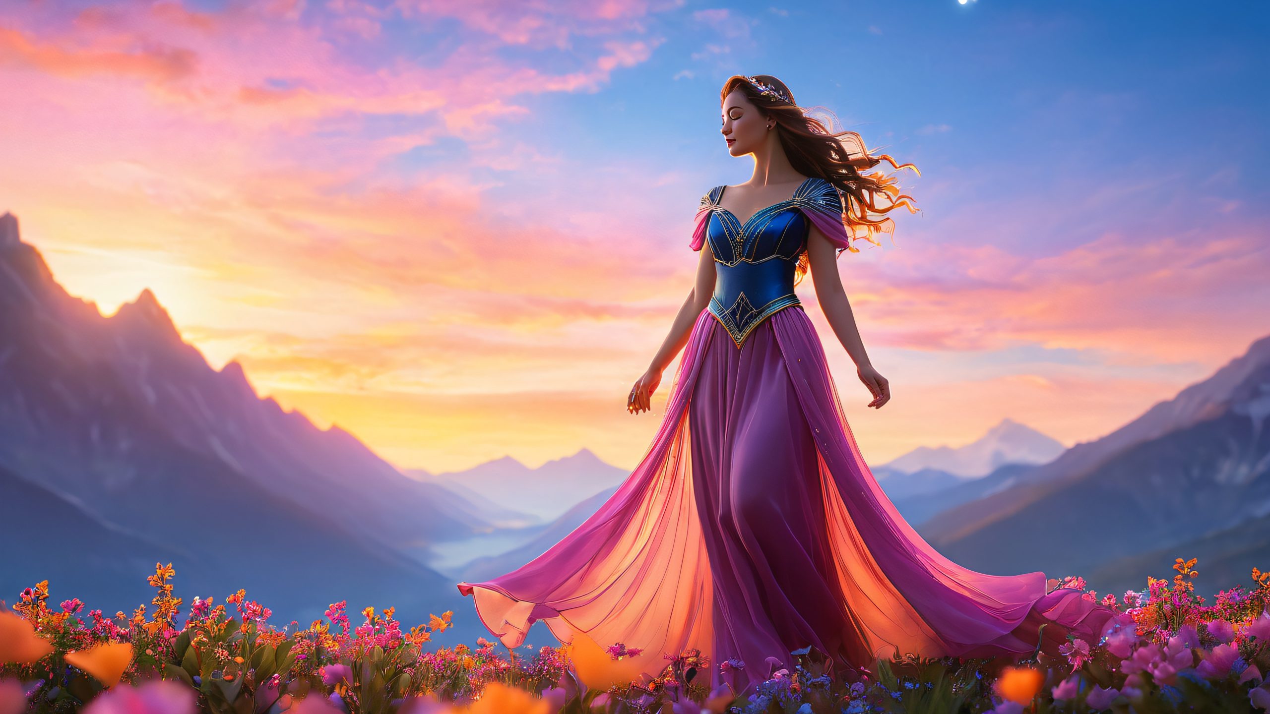 The scene features a majestic sorceress standing at the edge of a mystical realm, with her long, glossy dress flowing like a river of moonlit silk. The setting sun casts a warm, fiery glow upon the distant mountain silhouette, imbuing the air with an ethereal light that dances across the bokeh flowers scattered at her feet.