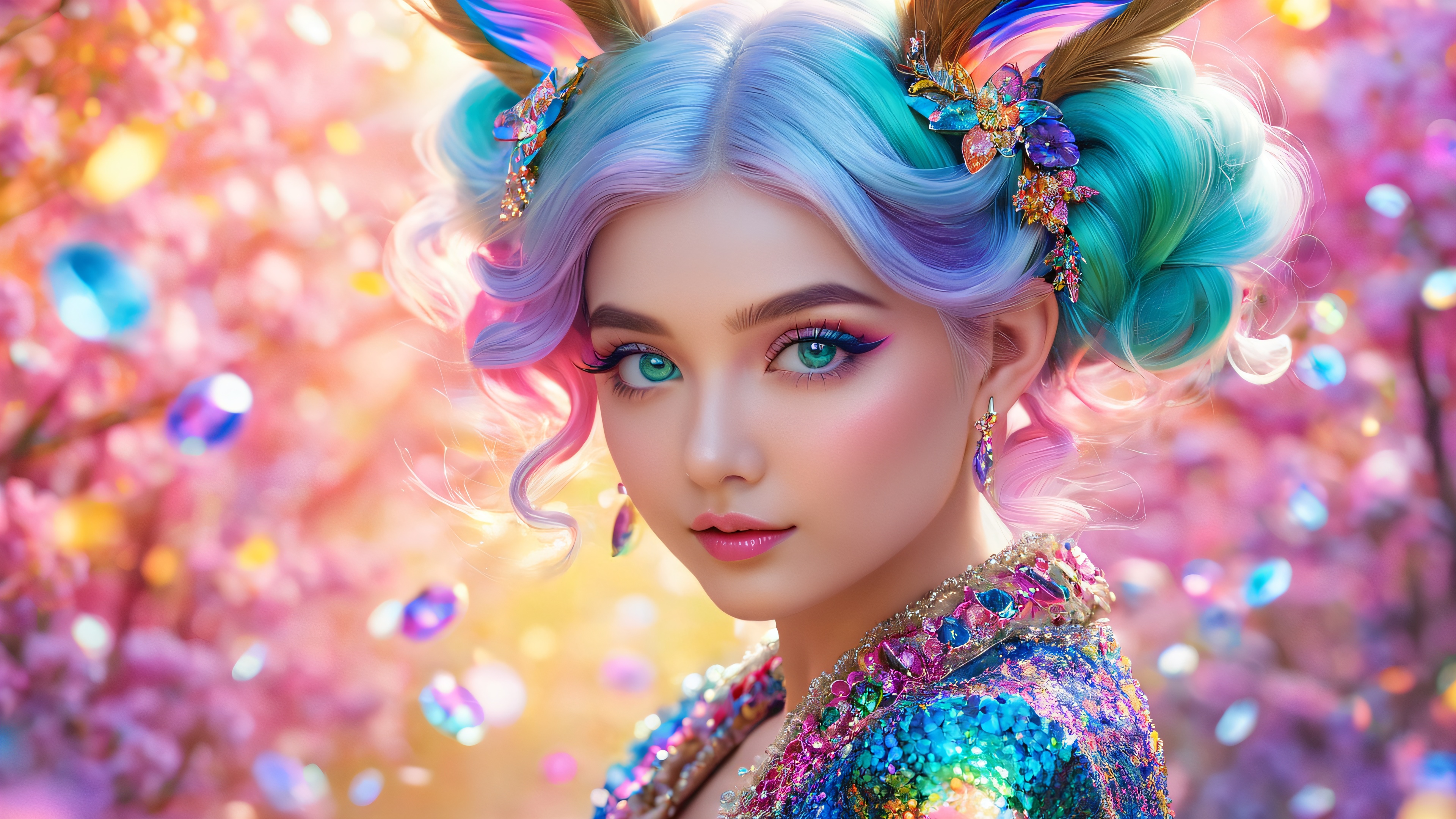 This breathtaking 4K wallpaper features a whimsical illustration of a young girl with mesmerizing multicolored eyes, her face framed by vibrant, ornate tendrils. She wears an elaborate jacket adorned with glittering accents and feathers, as if plucked from the wings of mythic creatures. The mystical background swirls with iridescent clouds, shimmering stardust, and an otherworldly glow, punctuated by subtle highlights and warm undertones.
