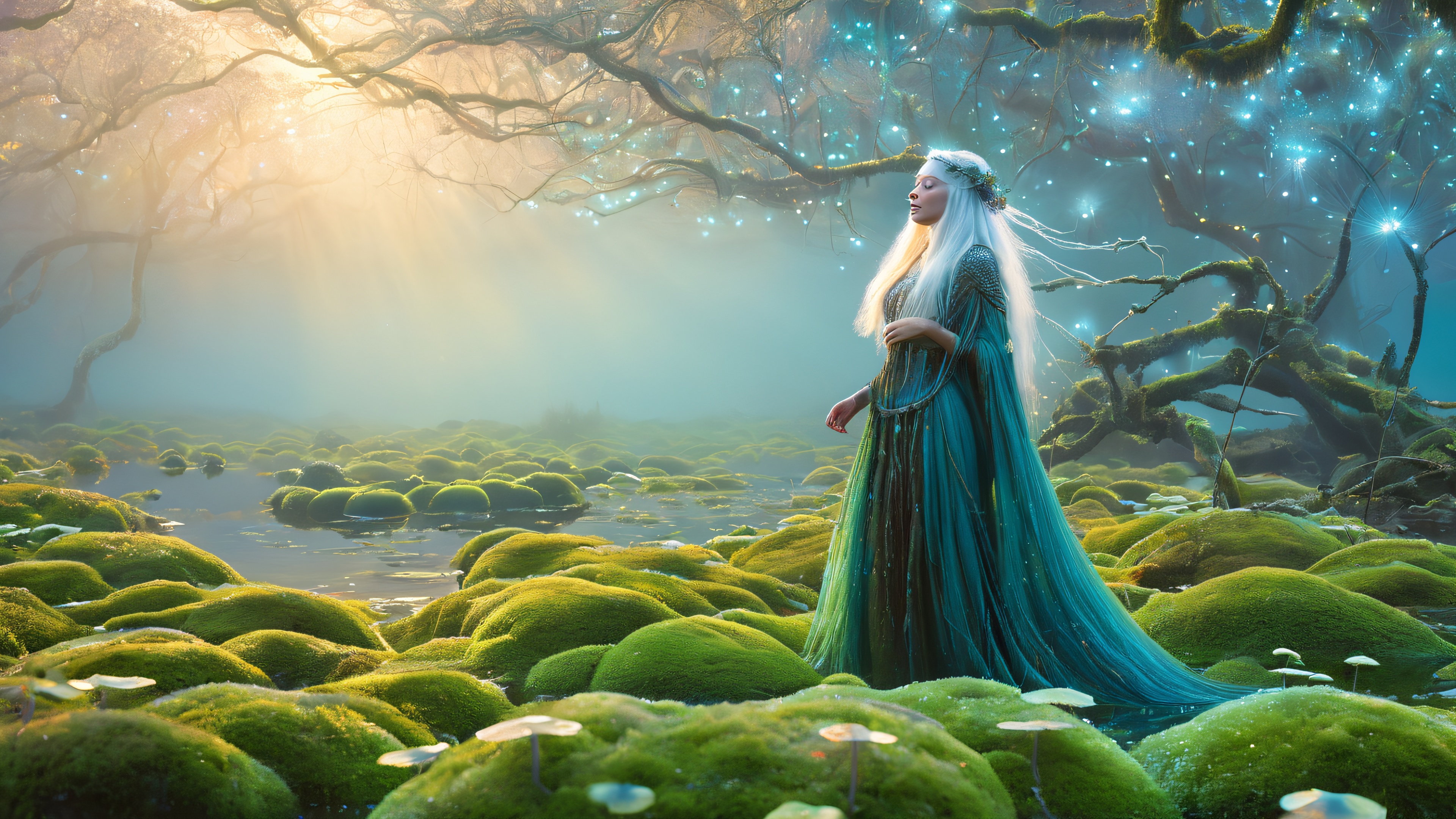 A mystical bog witch stands amidst glowing fungi, her long silver hair tangled with spider silk and moss, as she conjures a swirling vortex of mist and water.