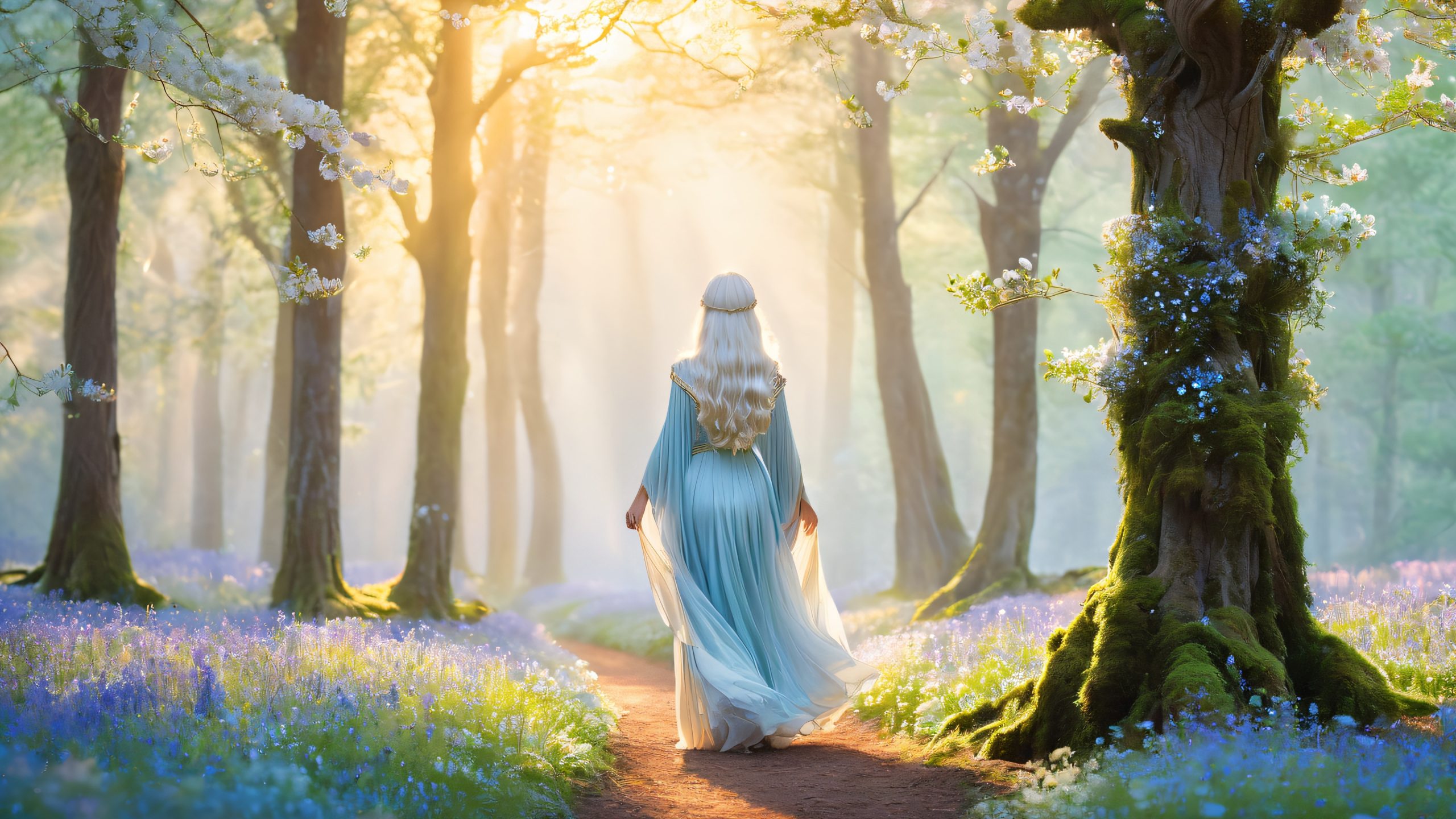 In this breathtaking 4K desktop wallpaper, a mystical being with silver hair and piercing blue eyes gently reaches out to escort a young adventurer through a mystical forest. The trees and flowers around them begin to glow with an otherworldly light, symbolizing the dawn of a new journey. The serene, misty forest is teeming with ancient, gnarled trees, their branches twisted and tangled, with a carpet of emerald moss and a canopy of starlight filtering through the leaves. The air is filled with the sweet scent of blooming wildflowers.