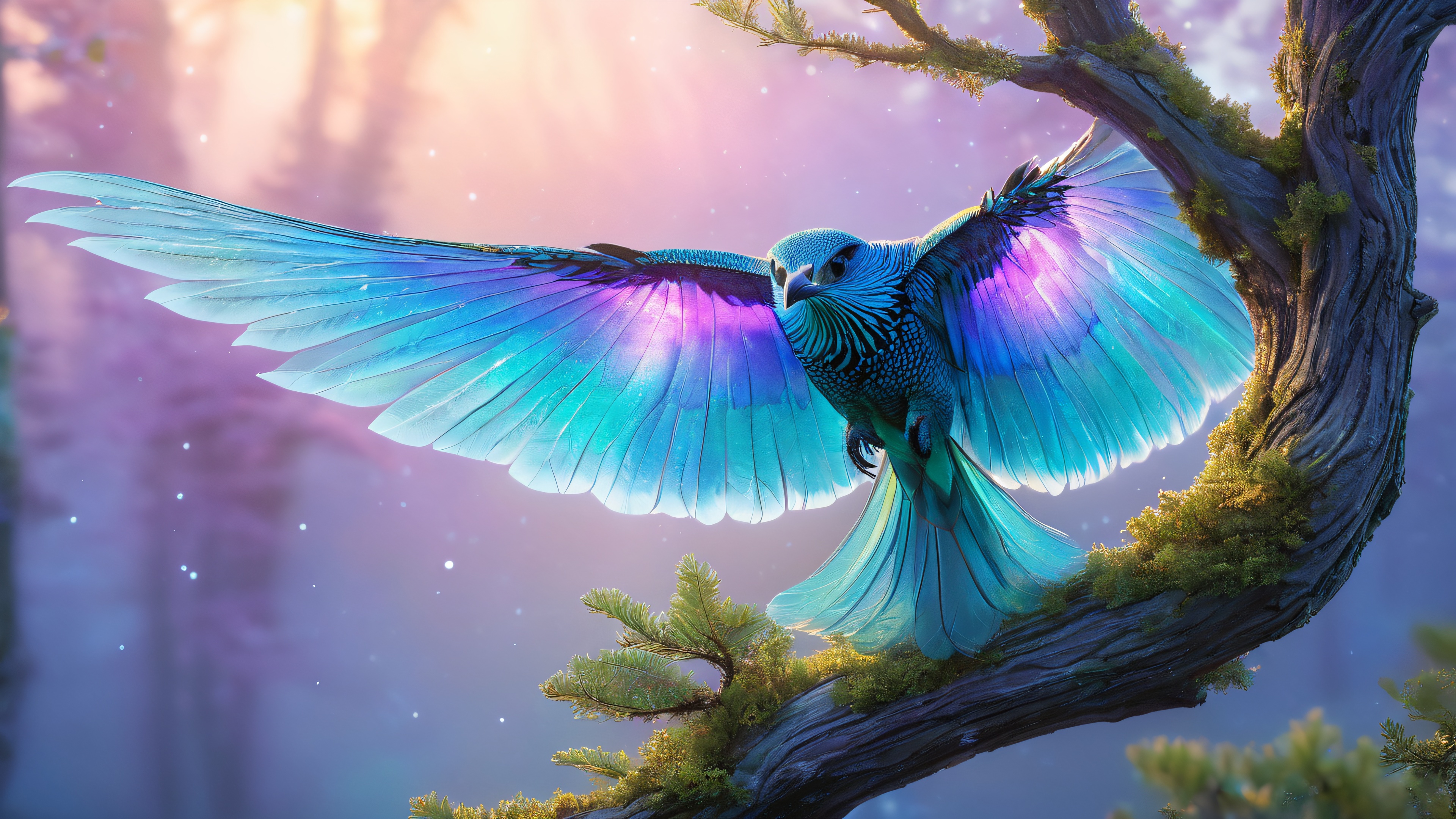 This stunning 4K wallpaper features a breathtaking, hyper-realistic scene of a majestic, iridescent creature in a mystical, mist-shrouded forest. The creature’s delicate, swirling scales shimmer like moonlit mist on a summer’s night, while its wingspan stretches wide, with feathers glowing like the aurora borealis. The ancient trees, twisted by time and weather, glow with a soft, ethereal light, casting a mystical ambiance. The palette of shimmering silvers, blues, and purples, with accents of golden light and misty greens, creates a masterpiece of highest quality and highly detailed design.