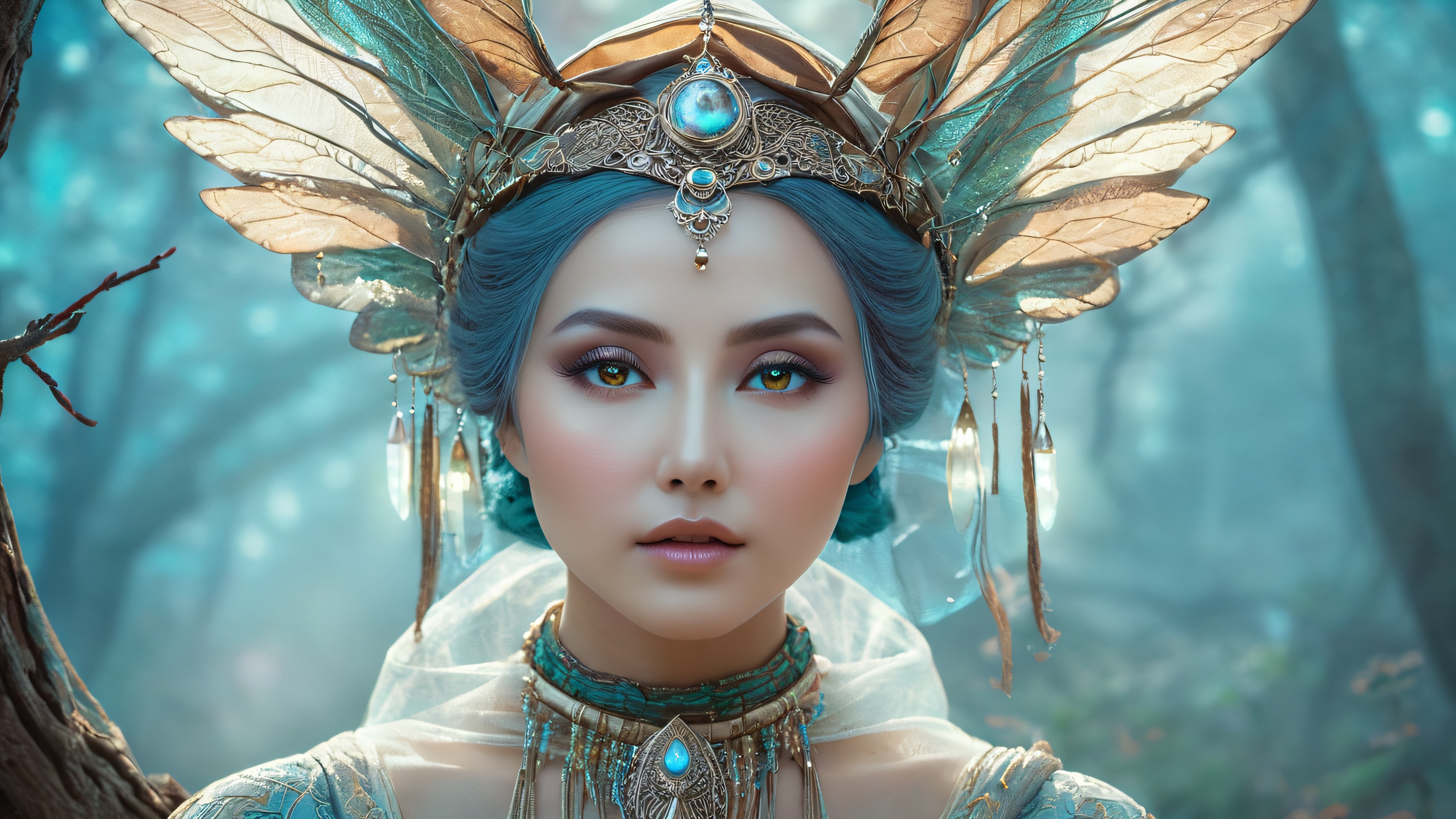This stunning 4K wallpaper depicts a mystical being with ethereal wings and an otherworldly aura, cloaked in an intricately woven veil of shadows and moonlight. The scene is set against a dark, mystical forest, where the moon casts an eerie glow upon the twisted branches and gnarled trunks of ancient trees. The air is heavy with the scent of decay and forgotten memories, and the sound of whispers echoes through the silence. The illustration features a blend of traditional and digital media, incorporating subtle textures and atmospheric lighting, with a focus on lunar illumination and long shadows that seem to have a life of their own.
