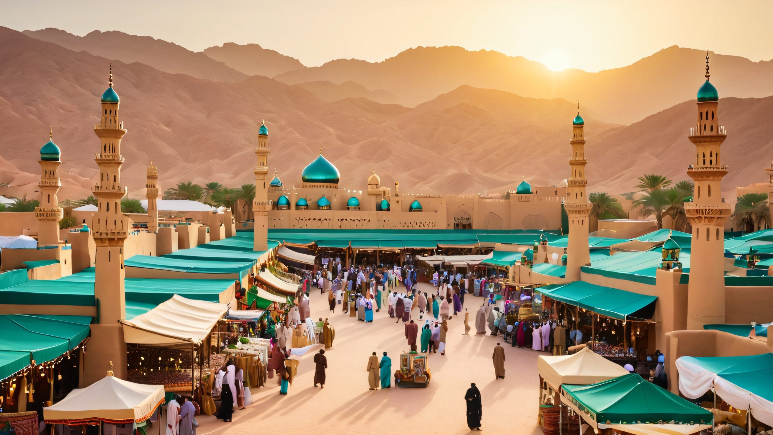 This stunning 4K wallpaper transports you to the vibrant streets of Najran Province, where ancient architecture and modern conveniences blend seamlessly. The scene is set against a warm, golden sunset, casting long shadows across the bustling streets. The colors are a kaleidoscope of turquoise, crimson, and gold, set against a backdrop of warm beige and sandy dunes, with pops of emerald green and sapphire blue from the lush oases and market stalls. Every detail is meticulously rendered, inviting you to step into the scene.