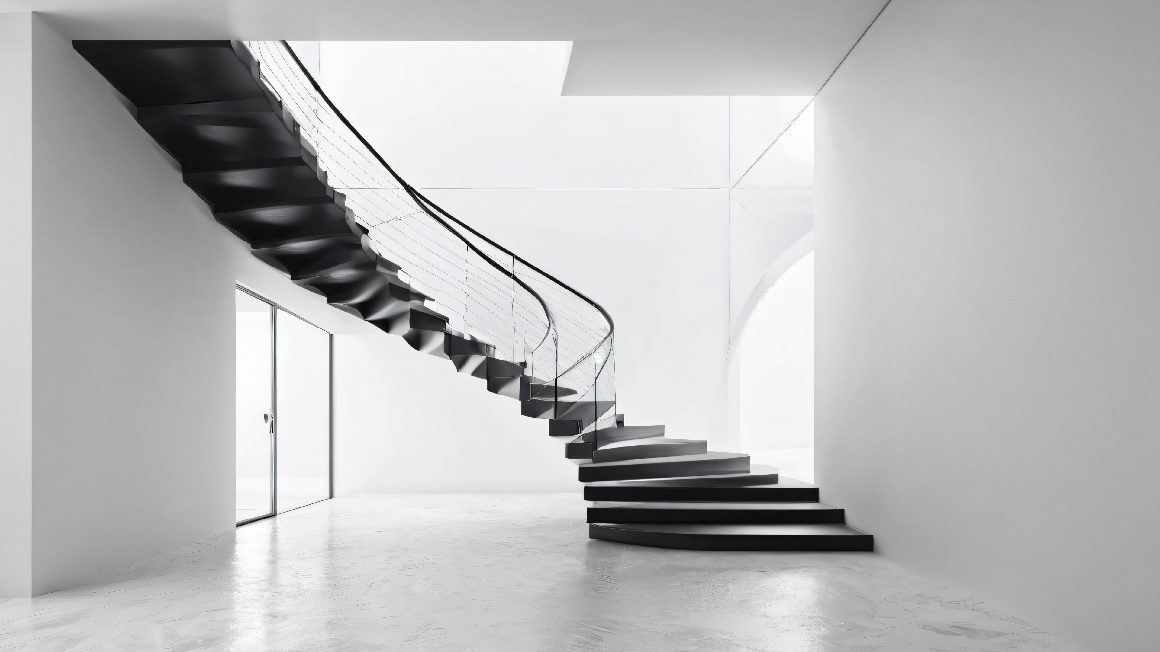 A breathtaking desktop wallpaper of Narrow Staircase, Perfectly clean vast pure void, extreme depth of field, Award-winning digital art, pristine clarity, Ethereal lighting with radiant, brilliant colors, ray traced reflections, and pristine clarity. Bright and airy., Monochrome with subtle texture, 16:9 aspect ratio, ethereal lighting, radiant, brilliant colors, ray traced reflections, pristine clarity, award-winning digital art, epic breathtaking scale, stunning visual impact, perfect composition, highly textured surfaces, intricate micro-details, physically based rendering, macOS wallpaper aesthetic, masterpiece, highest quality, highly detailed, 8k resolution.