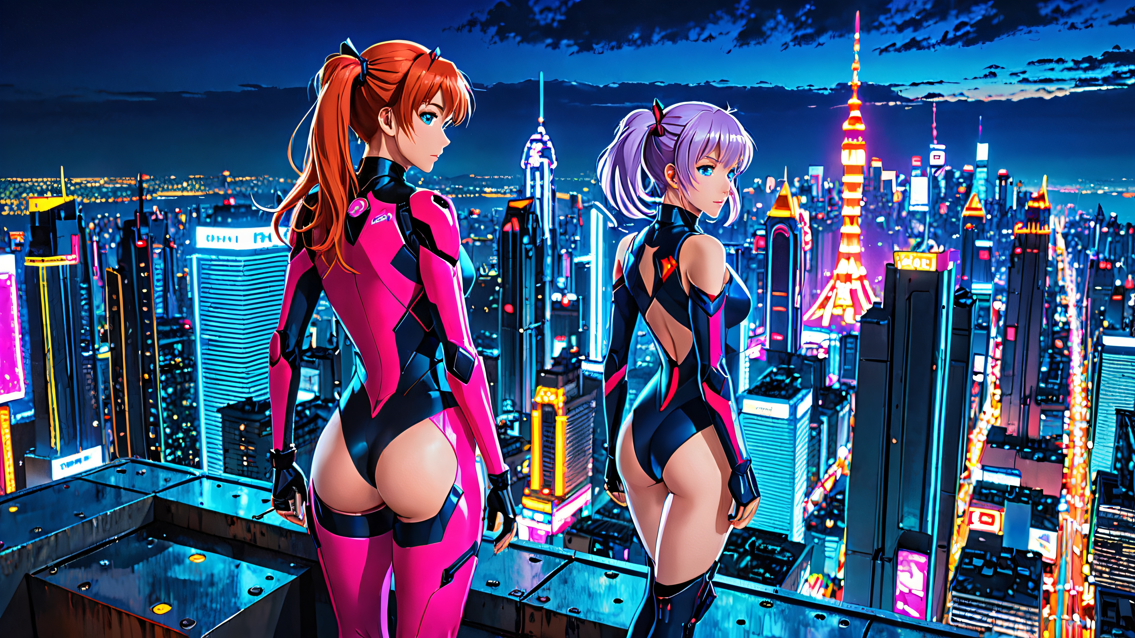 The breathtaking cyberpunk scene features a dimly-lit rooftop with rusty metal railings, crumbling concrete walls, and discarded machinery. The two iconic figures, clad in their signature plugsuits, stand at the edge of the rooftop, gazing out upon the sprawling city below. High-contrast lighting creates a cinematic atmosphere, with intricate details and textures adding depth to the scene.