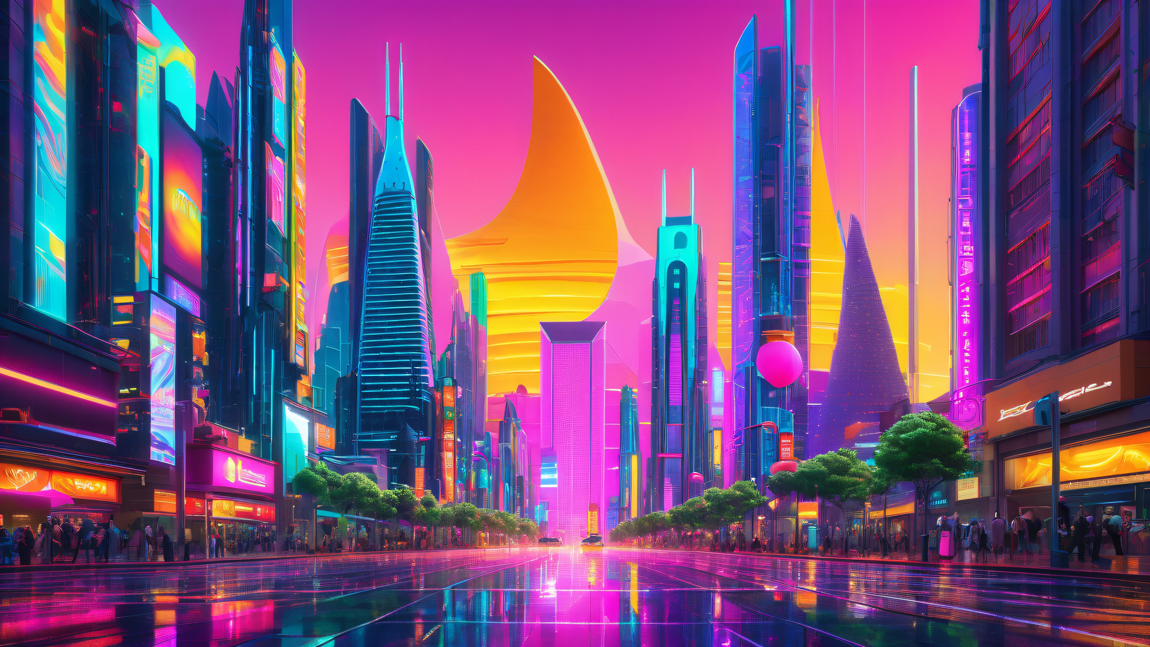 A hyper-realistic 4K desktop wallpaper of a vibrant, neon-lit metropolis with towering skyscrapers, sprawling cityscapes, and a kaleidoscope of shapes and colors.