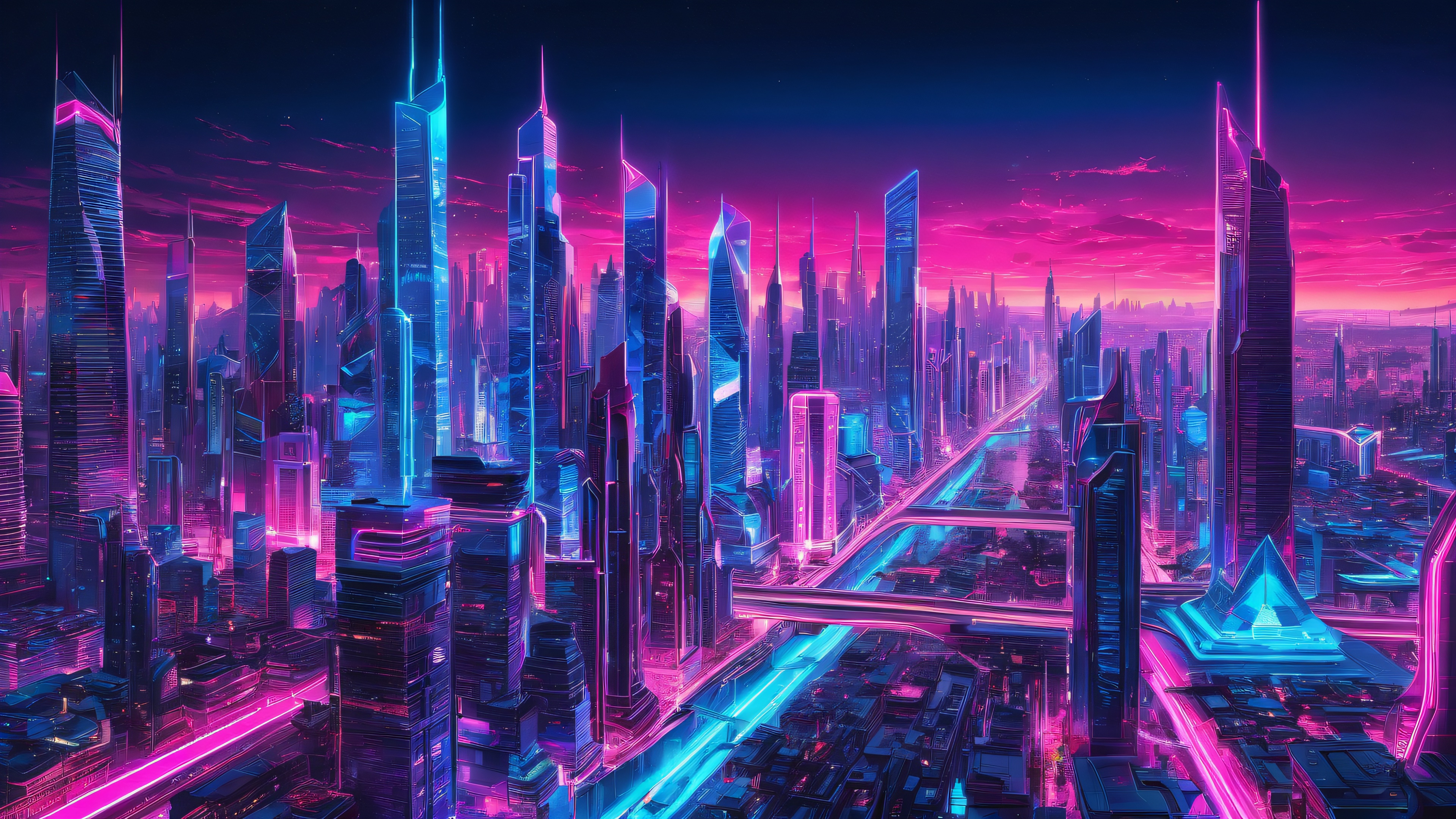 A breathtaking desktop wallpaper of Neon Cityscape, Perfectly clean vast pure void, extreme depth of field, futuristic cityscape in the background, Award-winning digital art, pristine clarity, futuristic architecture with vibrant neon lights, Ethereal lighting: radiant brilliant colors, ray-traced reflections, and pristine clarity. Bright and airy., [‘Neon Pink’, ‘Electric Blue’, ‘Metallic Silver’], 16:9 aspect ratio, ethereal lighting, radiant, brilliant colors, ray traced reflections, pristine clarity, award-winning digital art, epic breathtaking scale, stunning visual impact, perfect composition, highly textured surfaces, intricate micro-details, physically based rendering, macOS wallpaper aesthetic, masterpiece, highest quality, highly detailed, 8k resolution.
