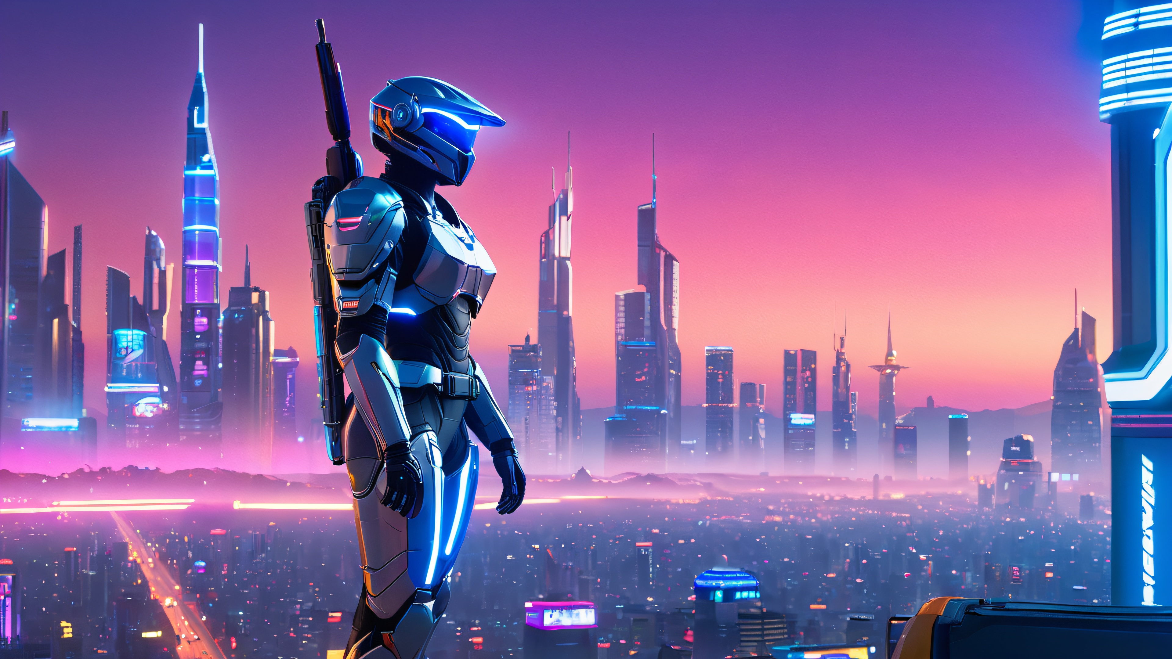 This breathtaking 4K desktop wallpaper features a heavily armored Ranger M.U. standing tall amidst a sprawling metropolis, bathed in a warm glow from neon-lit skyscrapers and holographic advertisements. The unit’s gaze is fixed on the distant, atmospheric horizon, where the cityscape meets the sky. The image is characterized by a blend of soft, blue-purple neon hues and warm, golden accents on the Ranger M.U.’s armor, set against a backdrop of dominant metallic silver, dark blues, and neon pink, with accents of fiery orange and electric blue.