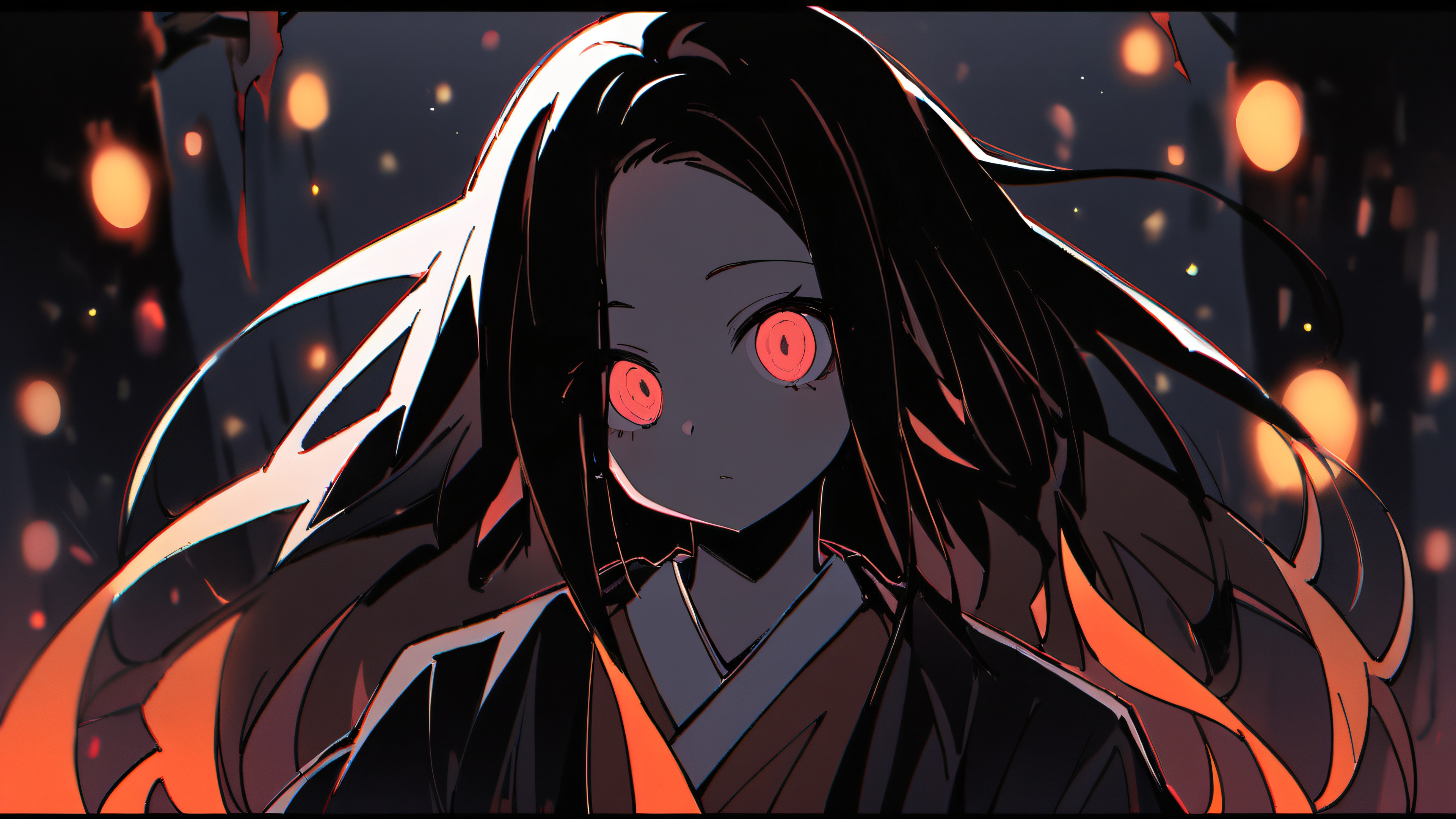 A breathtaking night scene of Nezuko Kamado standing alone in an endless, desaturated expanse of ash-like hues and striking contrast. Her elegant low-key lighting creates deep perfect blacks, while glowing lights subtly illuminate the barren land’s dramatic shadows. The 16:9 aspect ratio perfectly captures her contemplative gaze, as if she’s sharing a moment with the viewer.