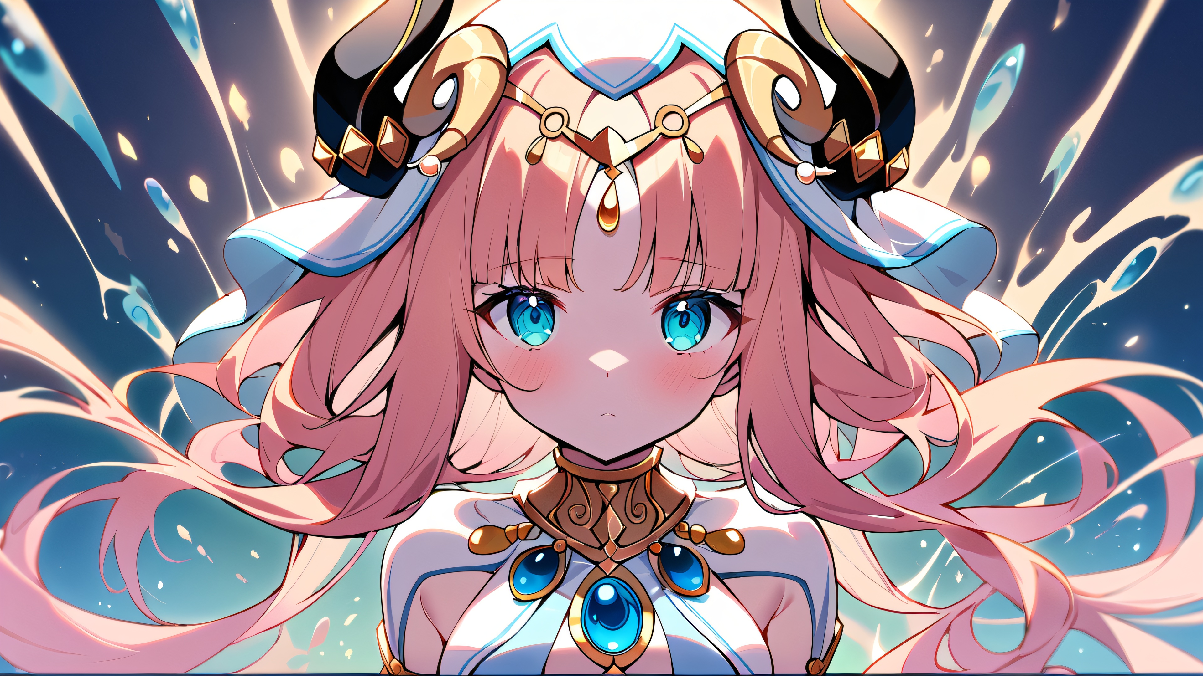 1girl, nilou, genshin impact, solo, masterpiece, best quality, very aesthetic, absurdres, highly detailed, looking at viewer, Perfectly clean vast pure void, extreme depth of field with subtle plaid patterns in the background, [‘Pastel Pink’, ‘Creamy White’, ‘Metallic Silver’], 16:9 aspect ratio, bright and airy, ethereal lighting, beautiful sky, cinematic lighting, vivid colors