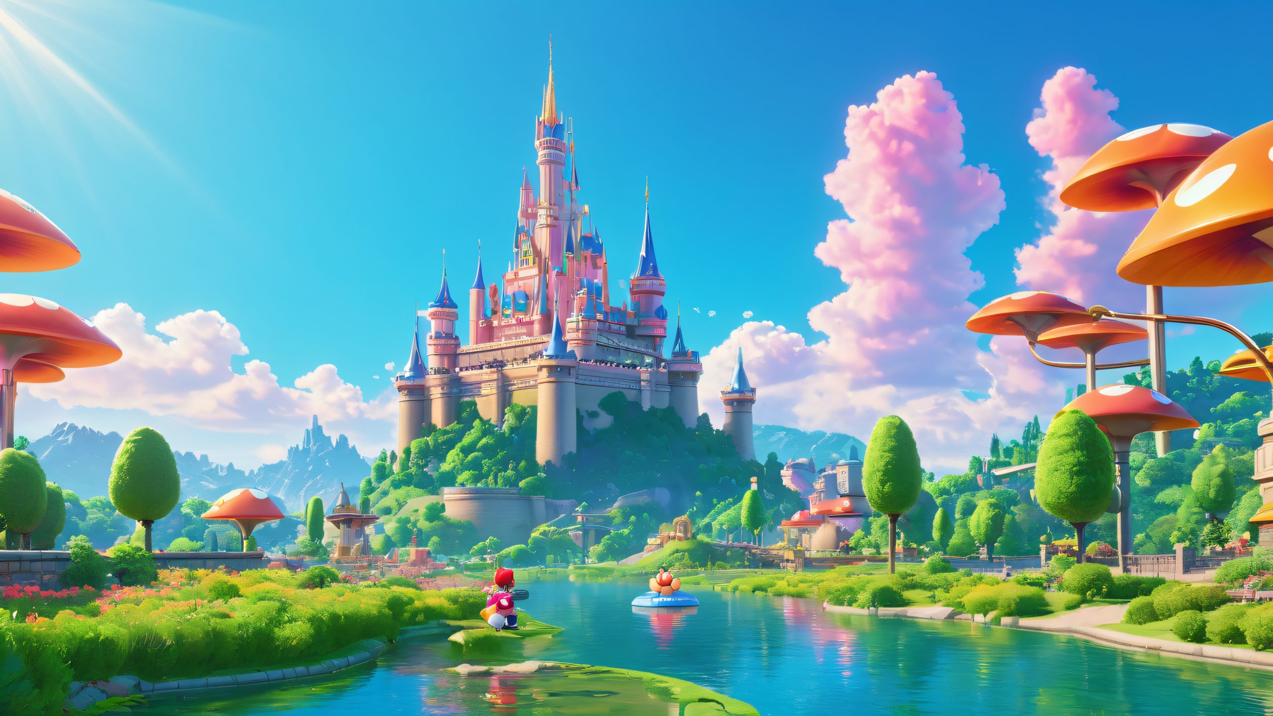 This stunning 4K wallpaper transports you to a whimsical world, where retro-futuristic architecture meets fantasy. The cityscape is a tapestry of bright colors, textures, and attention to detail, blending traditional and digital painting techniques. The scene comes alive with warm sunlight, soft shadows, and a hint of playfulness, reminiscent of classic Nintendo games.