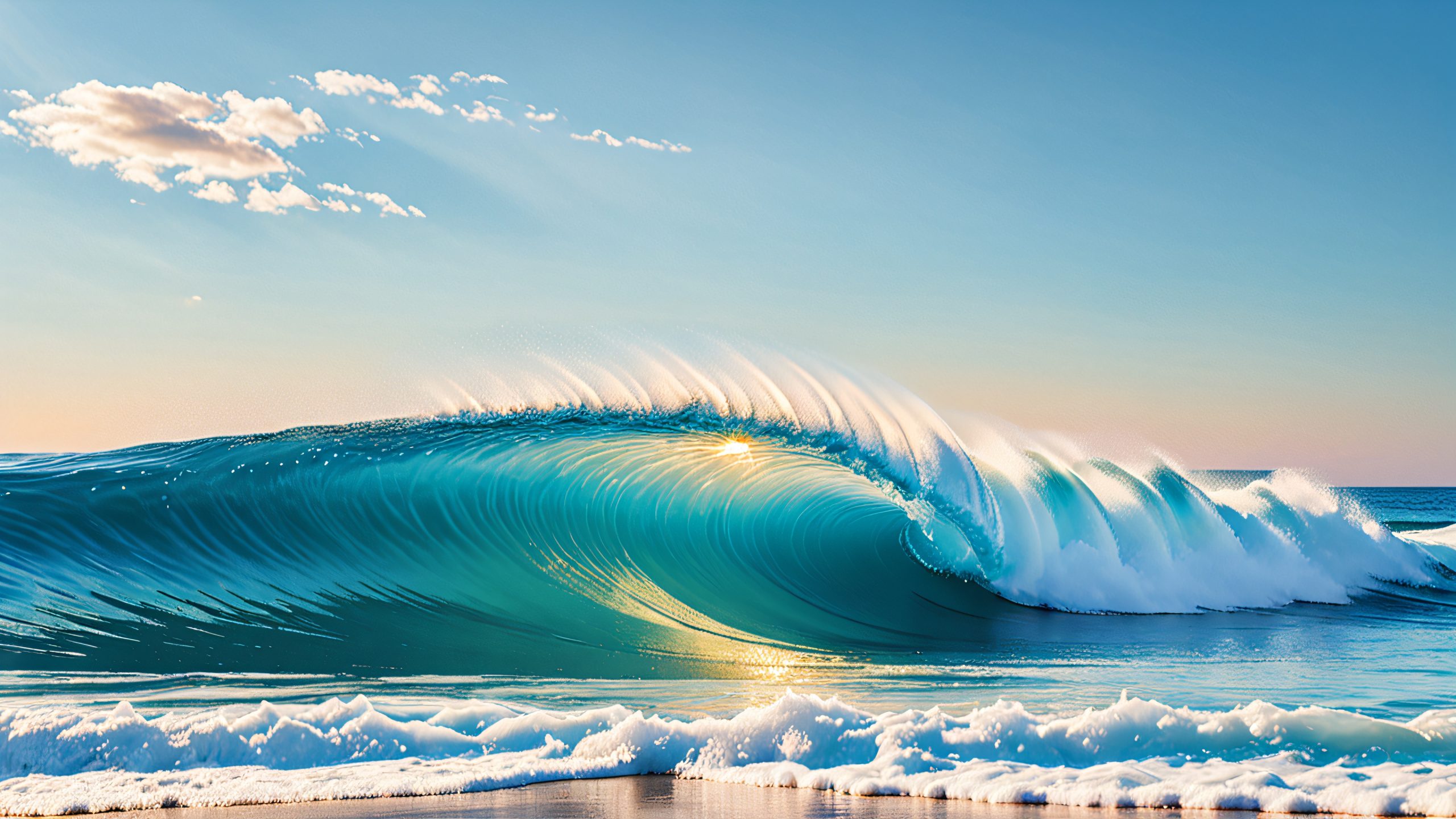 A serene ocean wave with clean lines and subtle gradient effects, flowing across the screen with intricate vector shapes forming the undulating surface, featuring a blue sky with white clouds and golden hour lighting.
