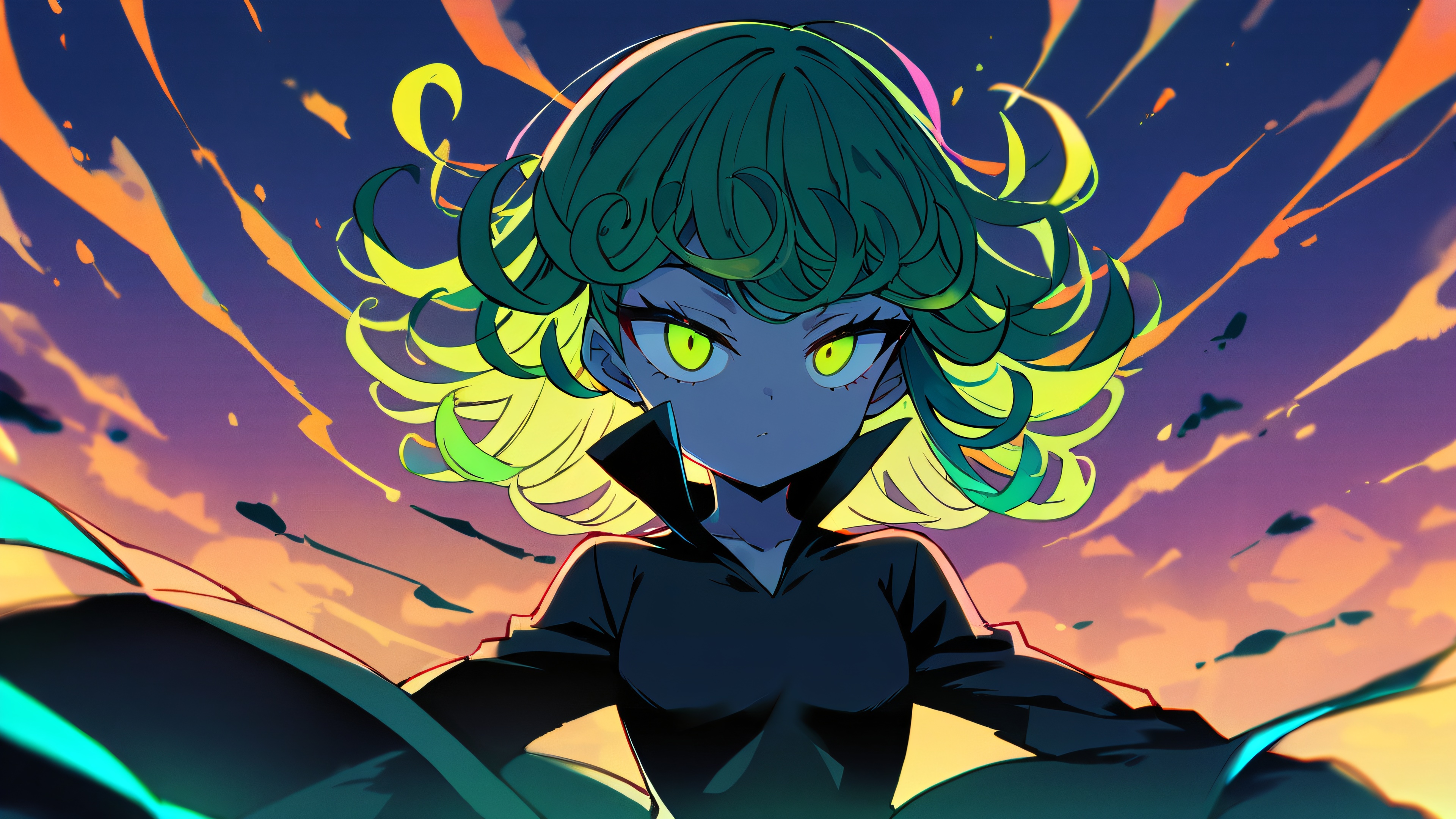 1girl, tatsumaki, one punch man, solo, masterpiece, best quality, very aesthetic, absurdres, highly detailed, looking at viewer, Perfectly clean vast pure void, extreme depth of field, [‘Brown’, ‘Orange’], 16:9 aspect ratio, bright and airy, ethereal lighting, beautiful sky, cinematic lighting, vivid colors