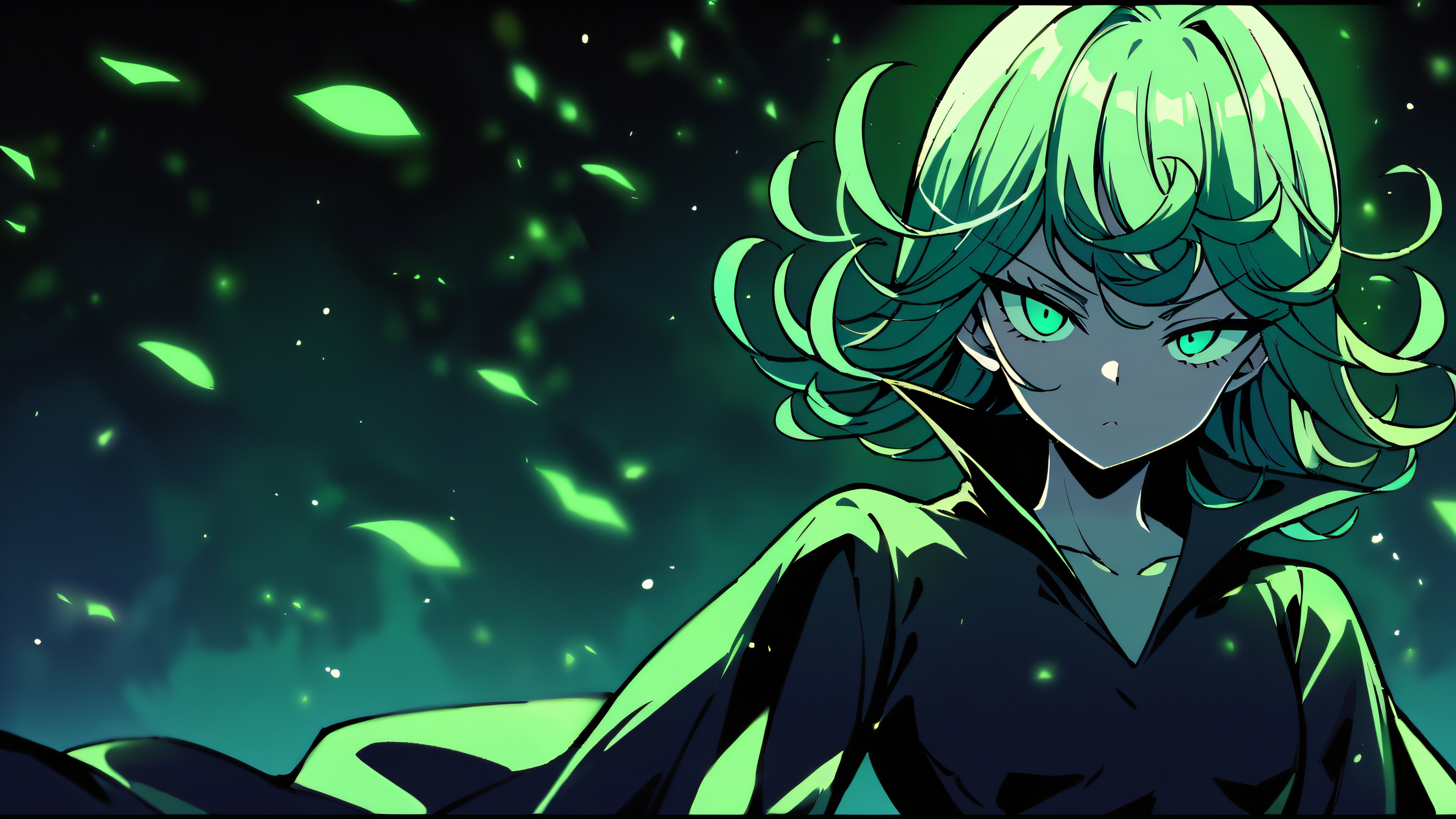 1girl, tatsumaki, one punch man, solo, masterpiece, best quality, very aesthetic, absurdres, highly detailed, looking at viewer, Perfectly clean vast pure void with extreme depth of field and a subtle plaid pattern in the background., #FF69B4, 16:9 aspect ratio, elegant low-key lighting, striking contrast, deep perfect blacks, night scene, glowing lights, dramatic shadows