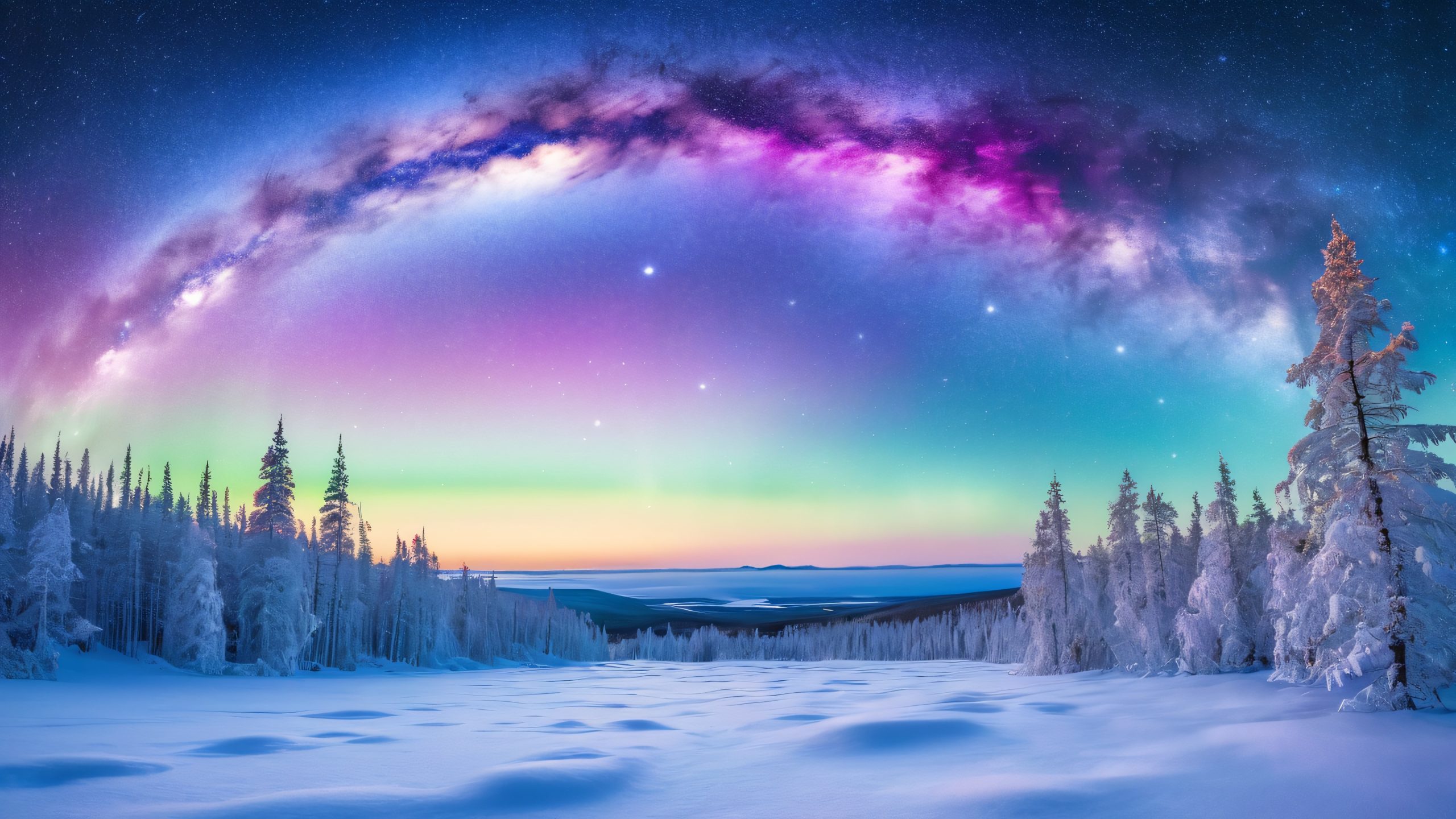 This breathtaking 4K desktop wallpaper features a stunning hybrid of watercolor and oil painting techniques, showcasing the majestic Orion constellation stepping out of the celestial realm into the snowy vastness of Lapland. The aurora-lit sky is set against a frozen landscape of snow-covered trees, ice crystals, and misty fog, with the Milky Way’s gentle glow adding a touch of magic to the scene. The soft, ethereal, and warm color palette features cool blues and purples, with hints of magenta and crimson, set against a backdrop of icy whites and dark, starry blues, with a touch of golden warmth from the aurora’s gentle light.