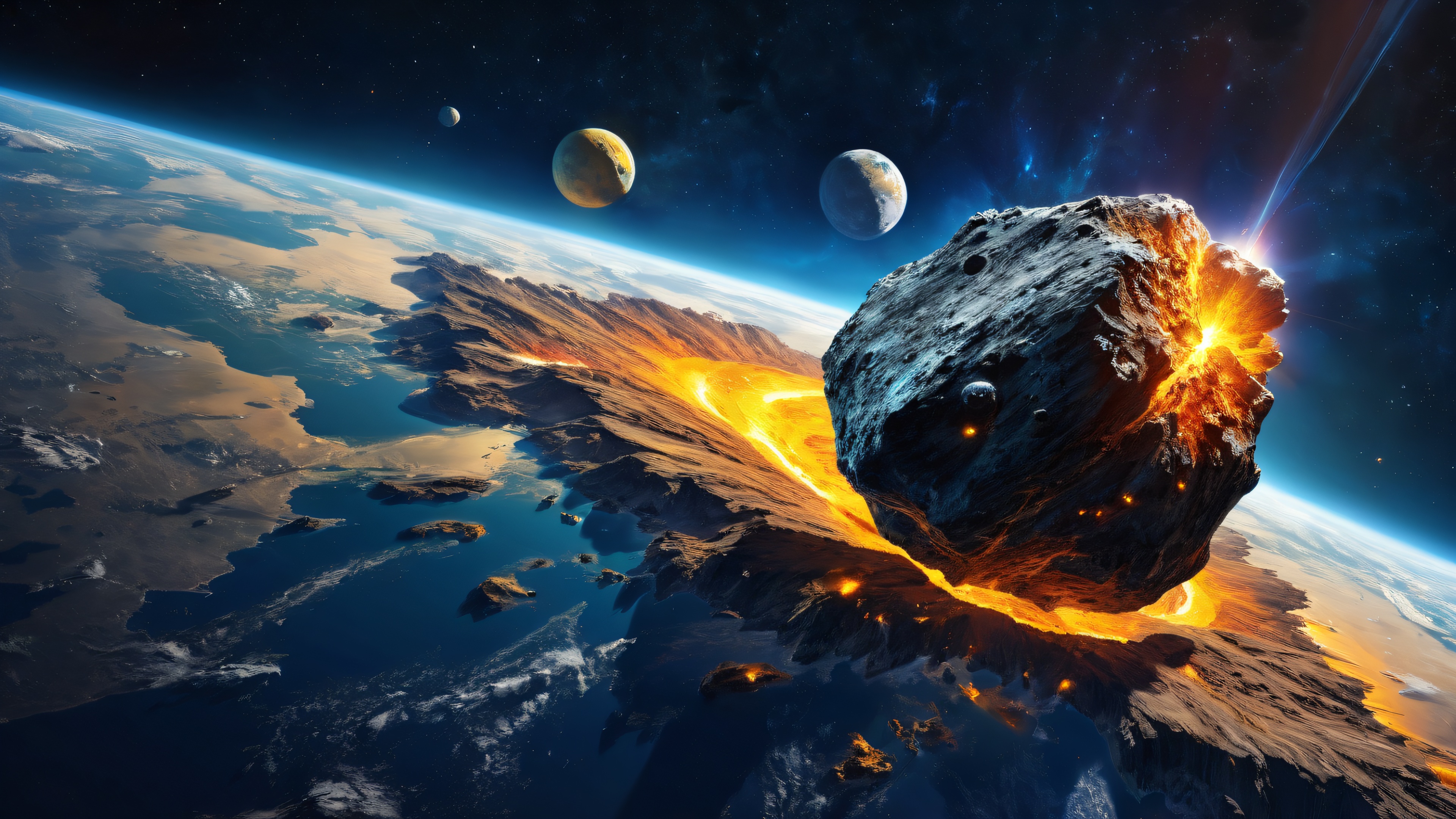 This stunning cosmic wallpaper features a pristine asteroid suspended against a backdrop of deep blues and golden hues. Ethereal lighting accentuates the radiant, brilliant colors, while ray traced reflections add a layer of depth and dimensionality. The high level of detail and texture on the asteroid’s surface is simply breathtaking, making this an ideal choice for anyone seeking a visually stunning desktop wallpaper.