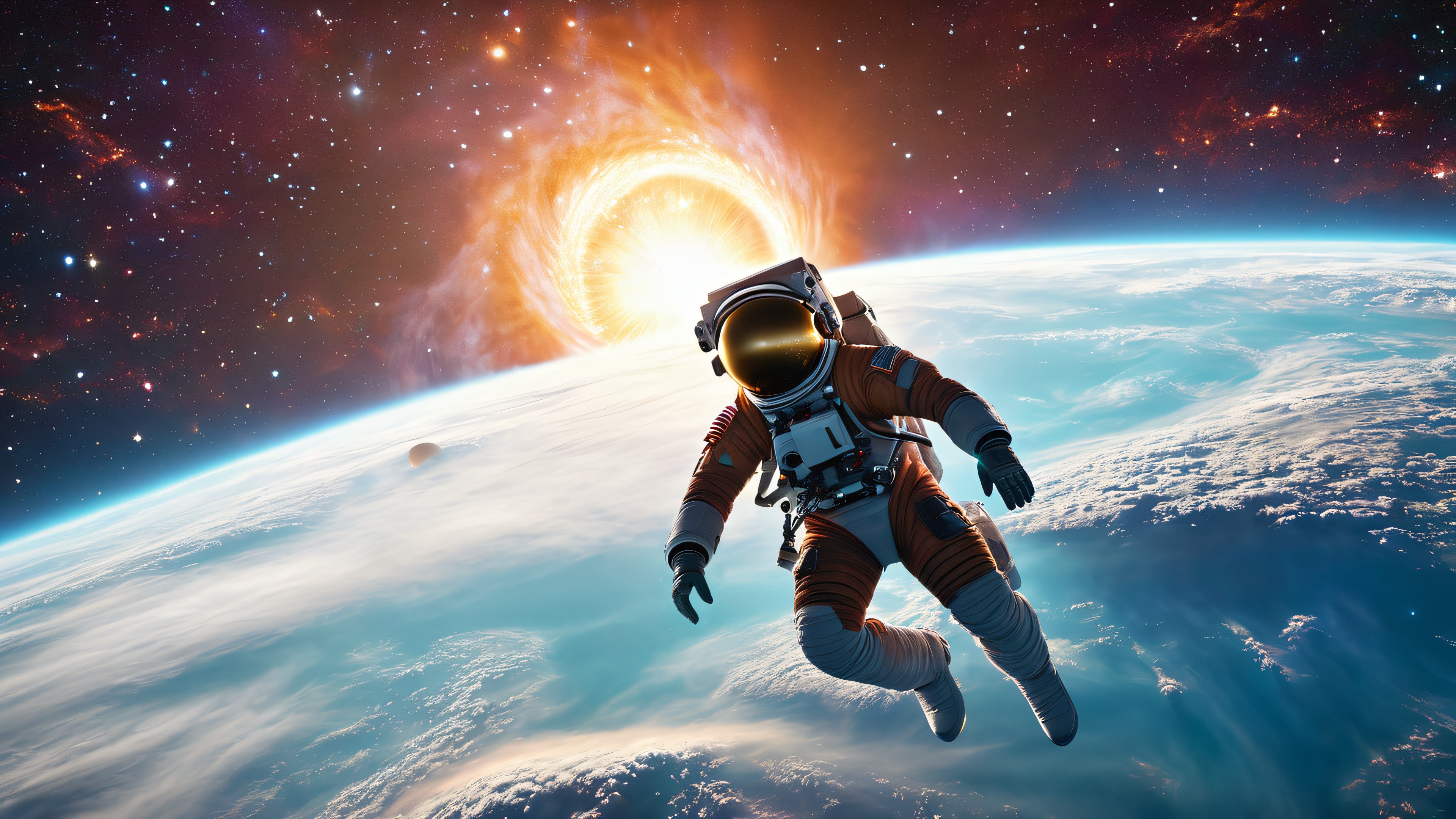 The astronaut floats serenely above the swirling clouds of gas and dust, illuminated by an ethereal glow. The darkness is punctuated by twinkling stars and wispy tendrils spiraling towards the black hole’s vortex.