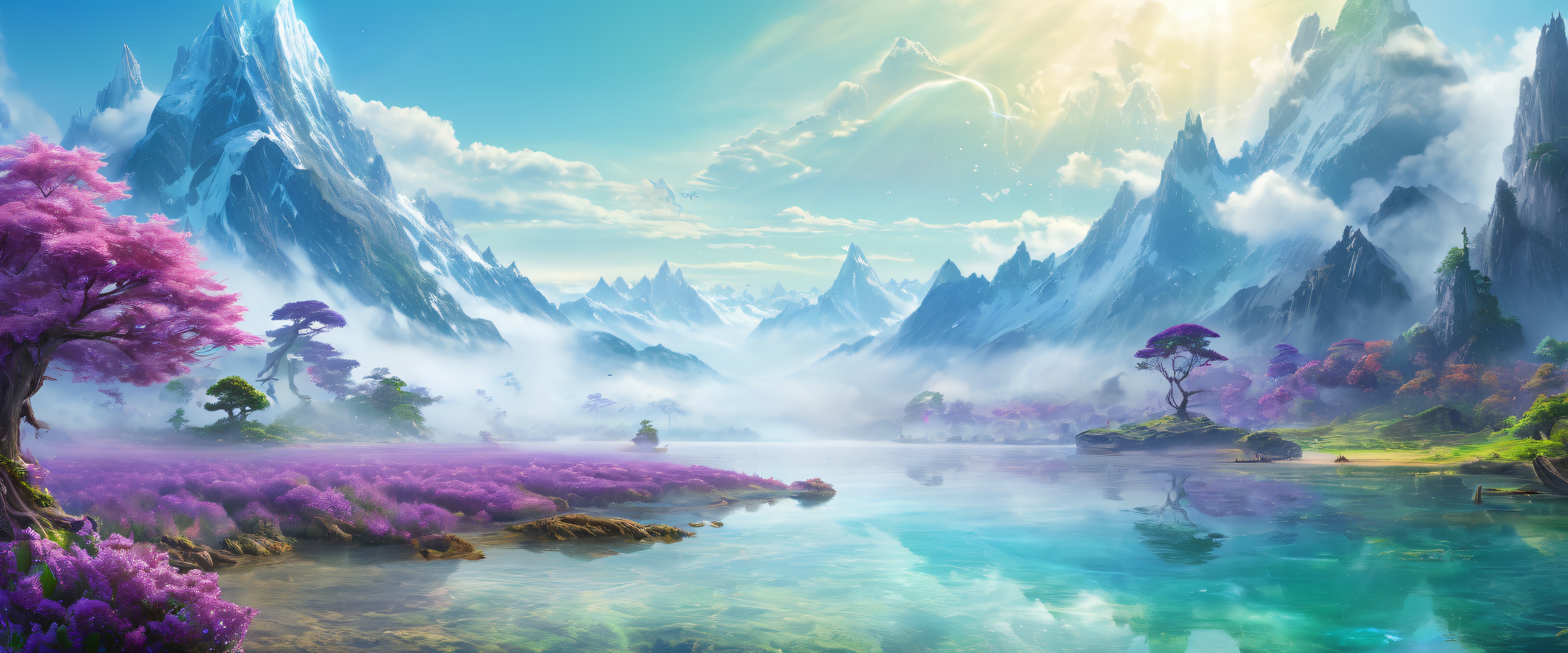 Soaring landscapes meet mystical creatures in this breathtaking digital art piece. Soft, warm glows illuminate the dreamlike scenery, complete with subtle shading that adds depth to the vibrant colors. Ray-traced reflections create a sense of realism, while pristine clarity showcases the highest quality in every detail.