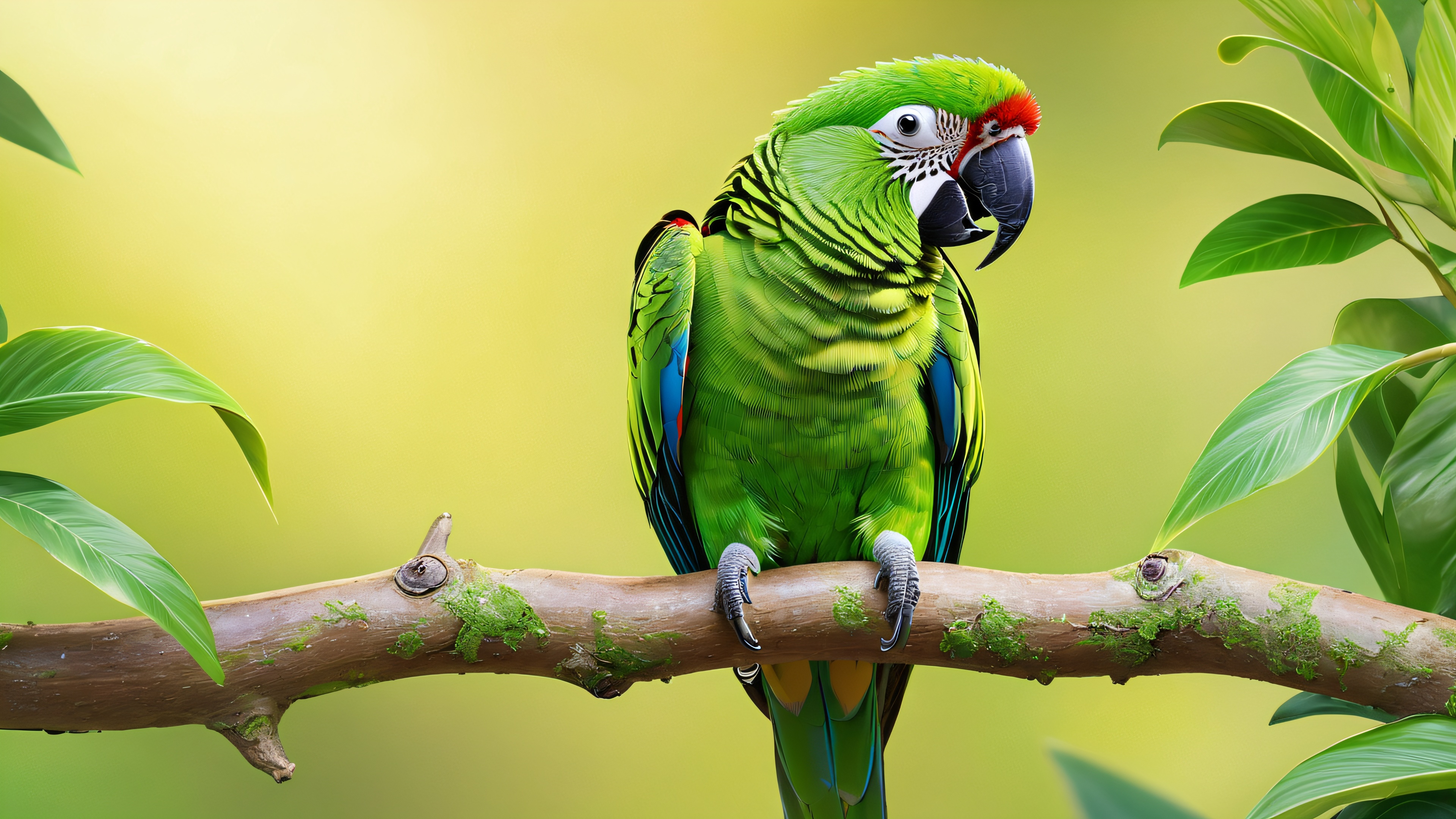 This stunning illustration showcases a vibrant green Forpus parrot in a tranquil, tropical setting. The bird’s iridescent feathers glimmer with subtle sheen, while its expressive eyes shine like polished emeralds. A tapestry of leaves, vines, and twisted tree branches provides a rich backdrop, punctuated by the scent of blooming flowers and fresh greenery. Warm golden light filters through the foliage, casting long shadows across the parrot’s plumage.