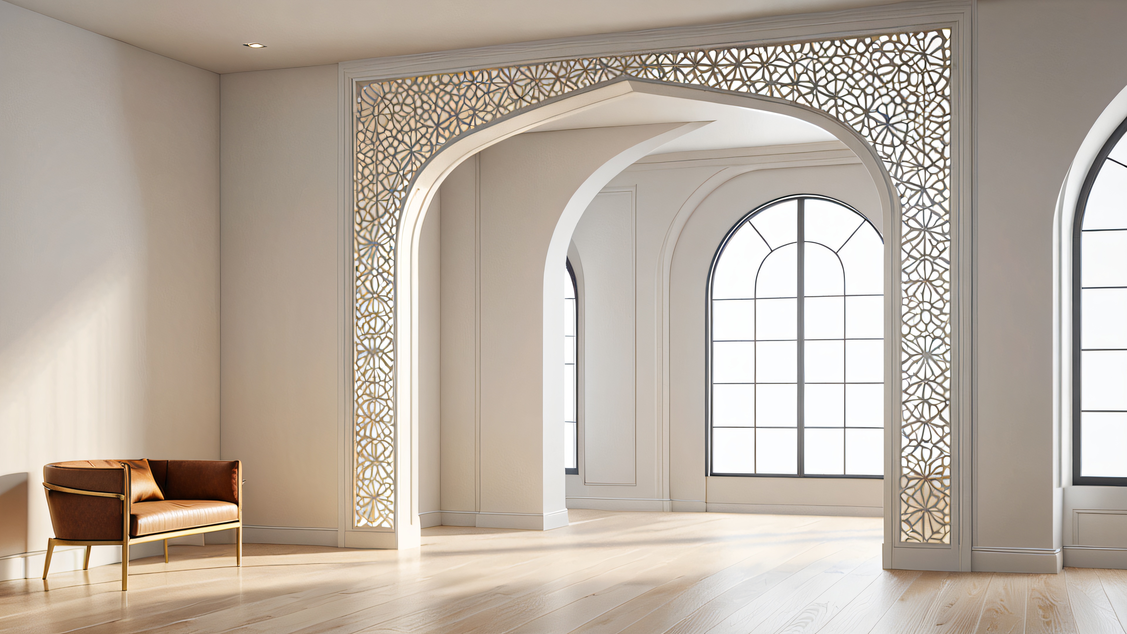 A serene oasis features an exquisite 3D archway with slender columns and ornate details crafted from interconnected polygons. The archway’s curves blend seamlessly into the surrounding environment, creating depth and dimensionality. Soft illumination casts subtle shadows and highlights the delicate curves and textures.