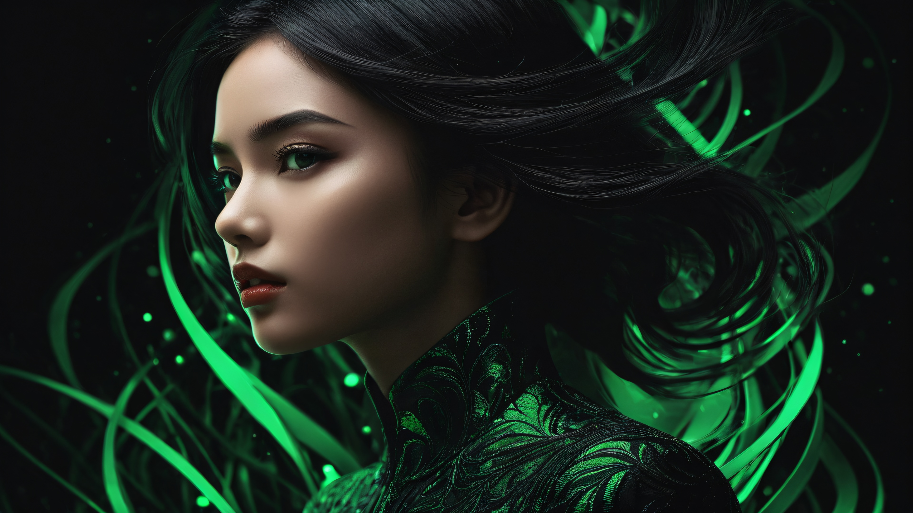 A breathtaking desktop wallpaper of 1Girl, perfeitamente limpo, vasto e puro vazio, extrema profundidade de campo, arte digital premiada, clareza imaculada, ESTÉTICA MODO ESCURO ELEGANTE. Pretos profundos e perfeitos, impressionante contraste nítido, and elegant luminescent accents., [‘Green’], 16:9 proporção, iluminação elegante e discreta, negros profundos e perfeitos, contraste impressionante, estética elegante do modo escuro, acentos luminescentes, cores ricas e profundas, arte digital premiada, escala épica de tirar o fôlego, impacto visual impressionante, composição perfeita, superfícies altamente texturizadas, micro detalhes intrincados, renderização baseada fisicamente, Estética de papel de parede do macOS, obra de arte, mais alta qualidade, altamente detalhado, 8resolução k.