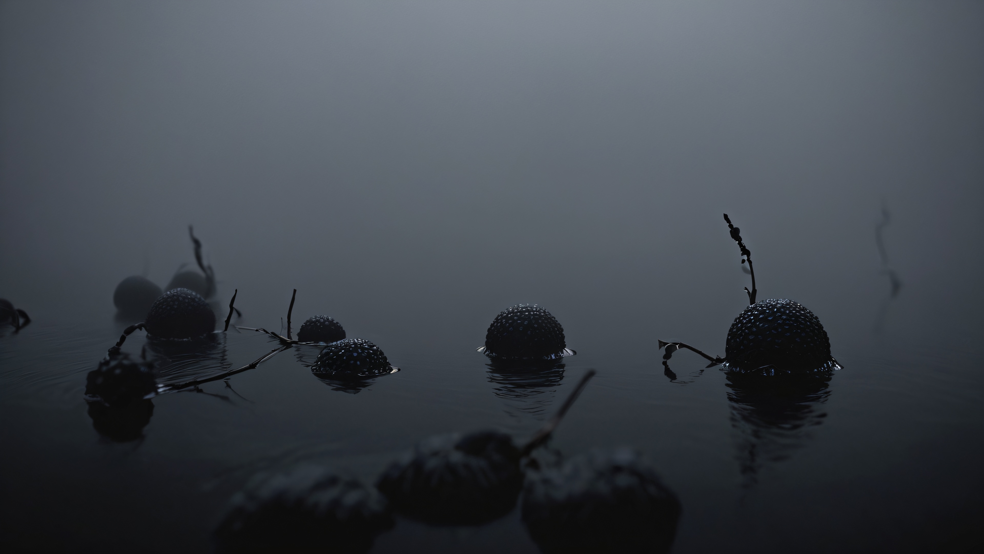 The wallpaper features a striking composition of surreal shapes emerging from the misty morning atmosphere. The extreme depth of field showcases delicate textures and details, while the creamy bokeh creates a sense of drama and mystery. The pure black background allows the viewer to focus on the unreal forms, blending seamlessly with the surrounding fog.