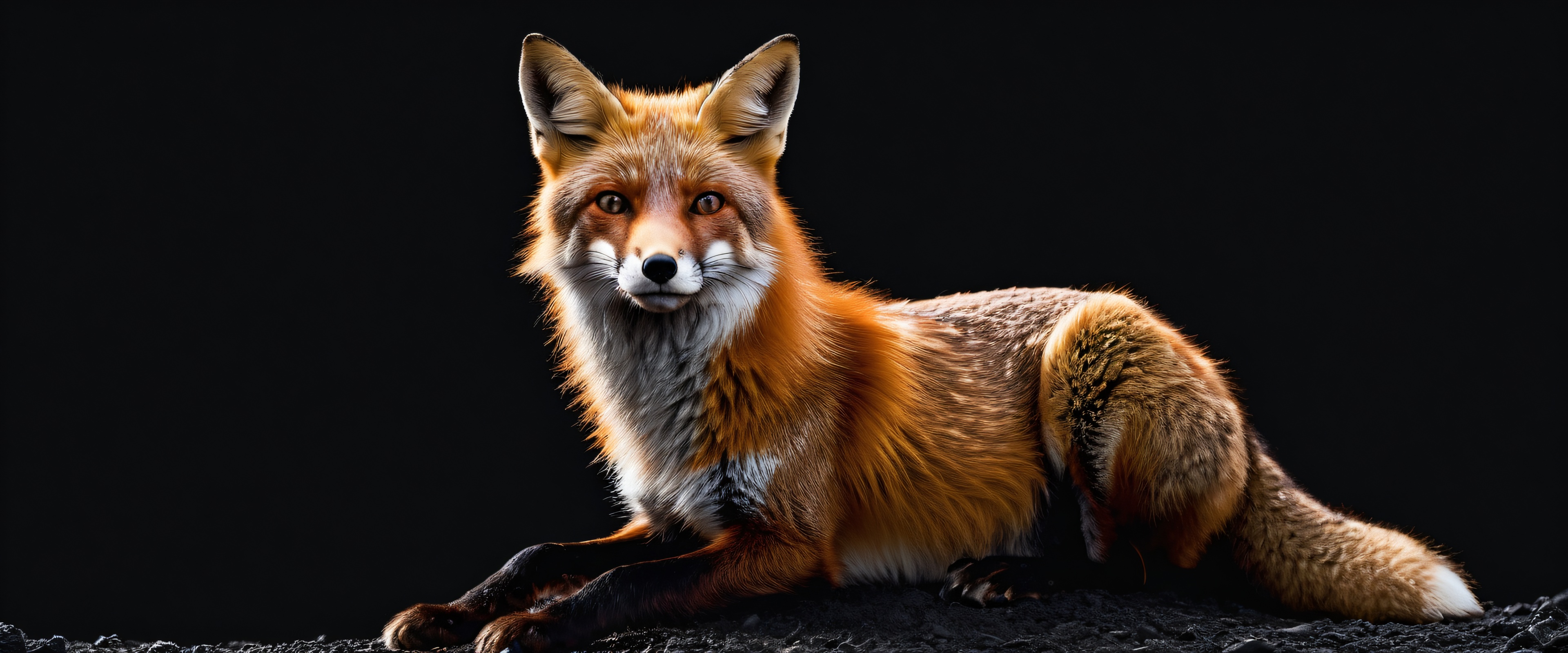 A breathtaking desktop wallpaper of fox, perfectly clean vast pure void, extreme depth of field, award-winning digital art, clareza imaculada, SLEEK DARK MODE AESTHETIC. Deep perfect blacks, striking crisp contrast, and elegant luminescent accents., [‘furry’], 21:9 ultrawide panoramic aspect ratio, epic wide shot, elegant low-key lighting, deep perfect blacks, contraste impressionante, sleek dark mode aesthetic, luminescent accents, deep rich colors, award-winning digital art, epic breathtaking scale, stunning visual impact, composição perfeita, highly textured surfaces, intricate micro-details, physically based rendering, macOS wallpaper aesthetic, obra de arte, highest quality, highly detailed, 8k resolution.